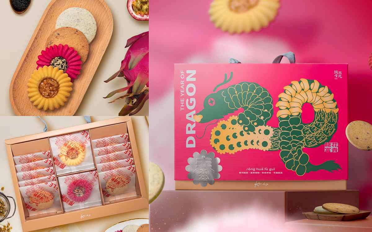 伴手禮品牌「旅旅食光」推出「龍花富貴伴手禮盒」,透過搶眼的桃紅色包裝設計增添過年喜氣,內含4款手工餅乾,分別是雅致伯爵茶奶油酥餅、甜蜜蔓越莓奶油酥餅、百香果羅蜜亞餅乾、火龍果羅蜜亞餅乾,奶油酥餅分別是嚴選唐寧茶及天然蔓越莓果乾製作,羅蜜亞餅乾則是採用百香果及火龍果凍乾粉製作,保留了天然水果風味,每一款皆十分酥脆不甜膩。