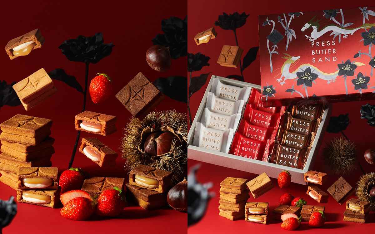 日本頂級人氣伴手禮 PRESS BUTTER SAND 春節限量龍年禮盒,共推三種人氣口味:經典原味、酸甜草莓以及秋冬限定的的栗子。堅持採用北海道頂級原料的PRESS BUTTER SAND,全程使用熱壓烤製工法、提升餅乾酥脆口感,清爽不膩口、奶油香氣層次飽滿,限量龍年禮盒中包含品牌最具代表性的原味焦糖奶油夾心餅乾、選用甘王草莓的草莓焦糖奶油夾心餅乾、以及冬季限定的栗子焦糖奶油夾心餅乾,三重口味一次滿足。禮盒設計由日本知名插畫家柊有花操刀,紅白與銅色搭配象徵花開富貴,精緻閃耀的包裝營造年節的喜慶氛圍。