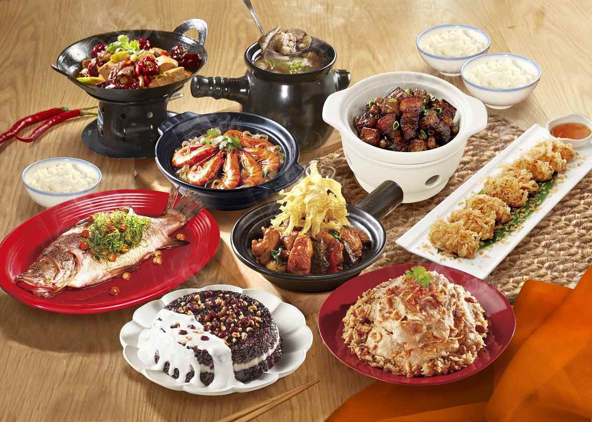 年菜套餐內容:御膳海陸甜三拼(御品海南雞 /涼拌鮮中卷/酥炒芋心)、琥珀麥片豬肋排、極上龍皇聚寶盆、龍鳳呈祥荔枝魚、扇貝蘆筍燴時蔬、金湯時蔬獅子頭、蒲燒鰻紫菜燜飯、傳香翠玉燉雞湯、黑金魚子醬