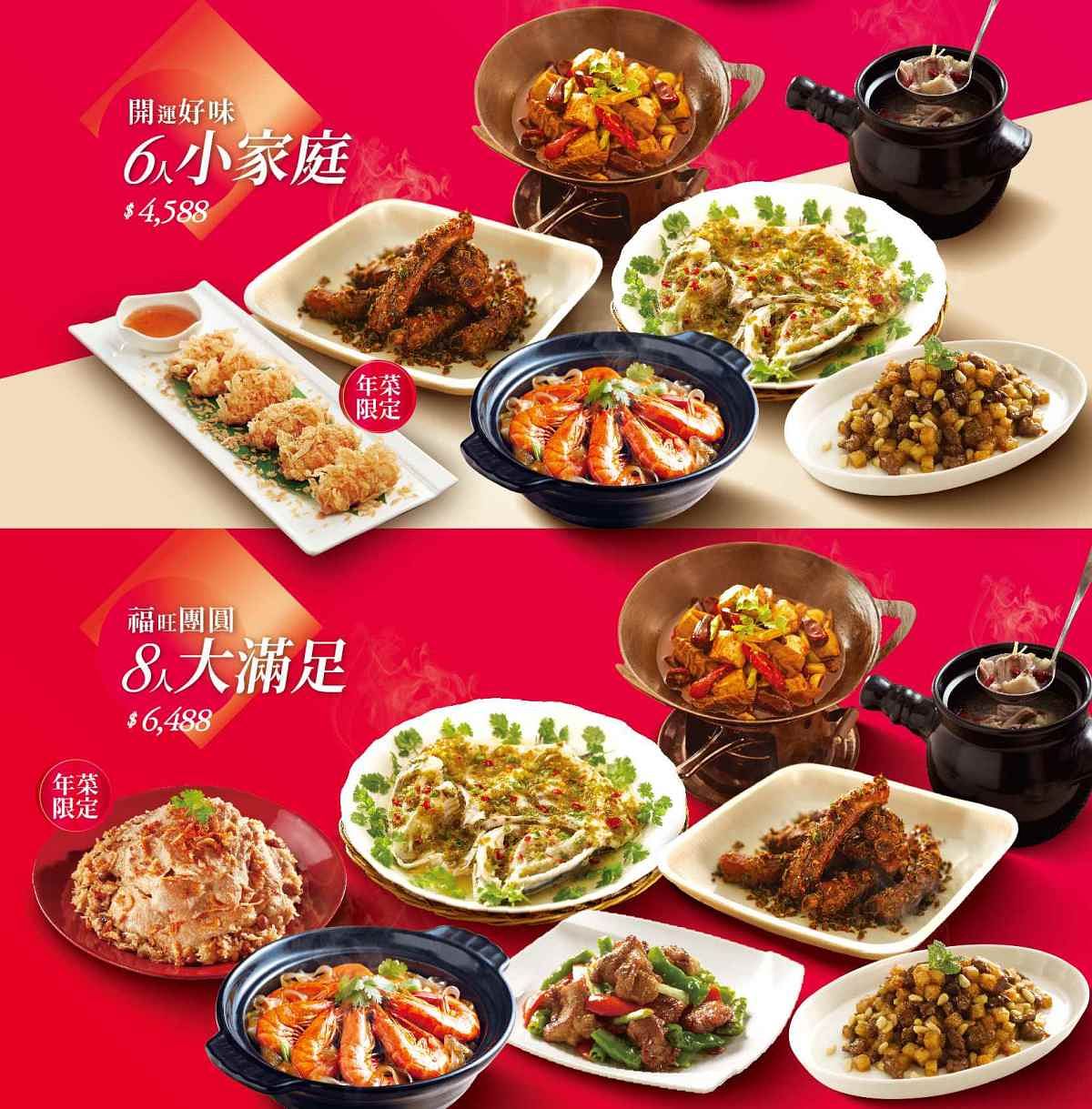 跨菜系中式料理《時時香》 集結川、台、粵等各大菜系精華,今年規劃6人天菜迎春小家庭4,088元及8人食尚團圓大滿足6,488元,內含多道必吃招牌菜,充滿獨家秘製花雕酒香的「3.5杯雞」、下飯的「 阿婆紅燒肉」、「剝皮辣椒燉雞湯」 等。另外還有限定年菜「招財樹子蒸鱸魚」,以及同樣是年節限定的「鮮蝦粉絲煲」。