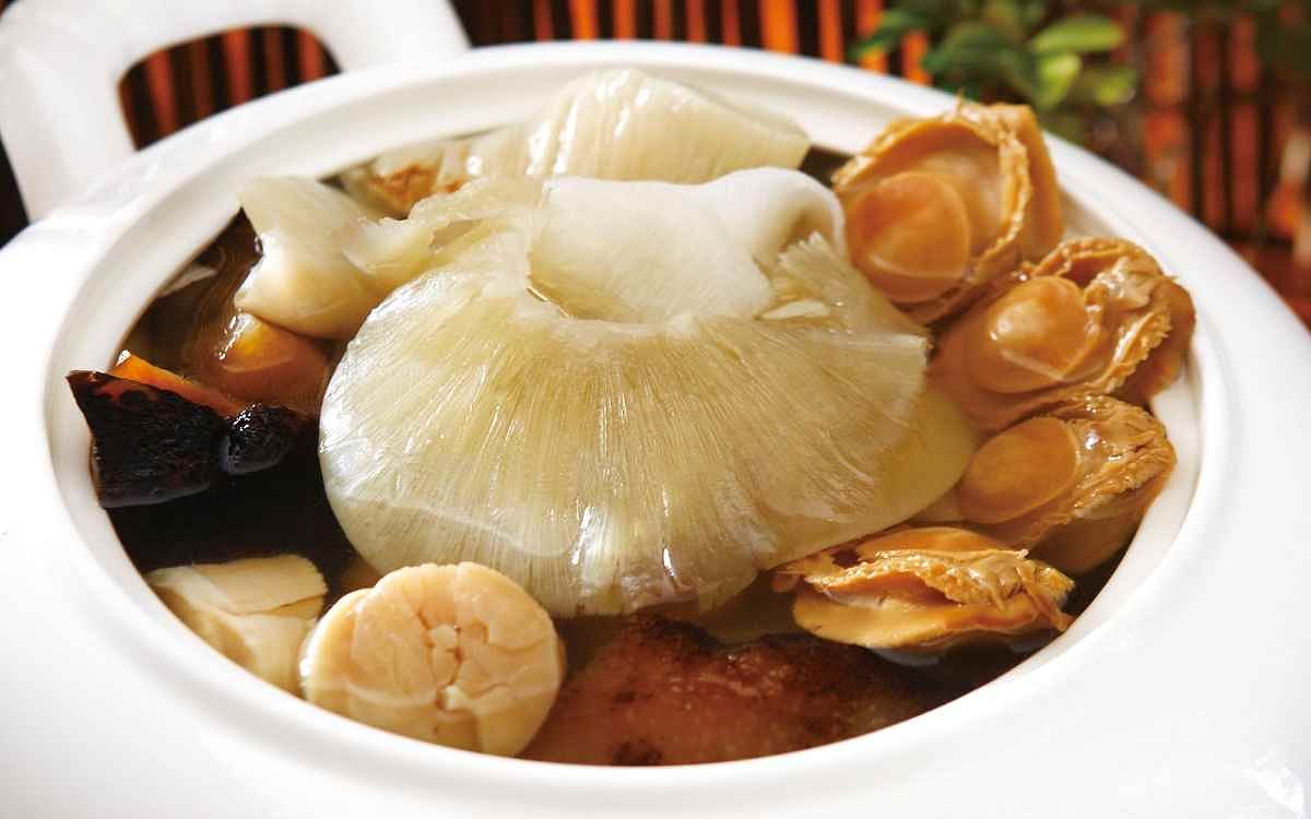 8人份的年菜極致代表作「潮式極品佛跳牆」,以老母雞、金華火腿、排骨、後腿肉精熬24小時,再加入極品花膠、珠婆參、金山勾魚翅與鮑魚、干貝、小土雞等高貴食材慢燉,湯清膠濃、齒頰留香。。