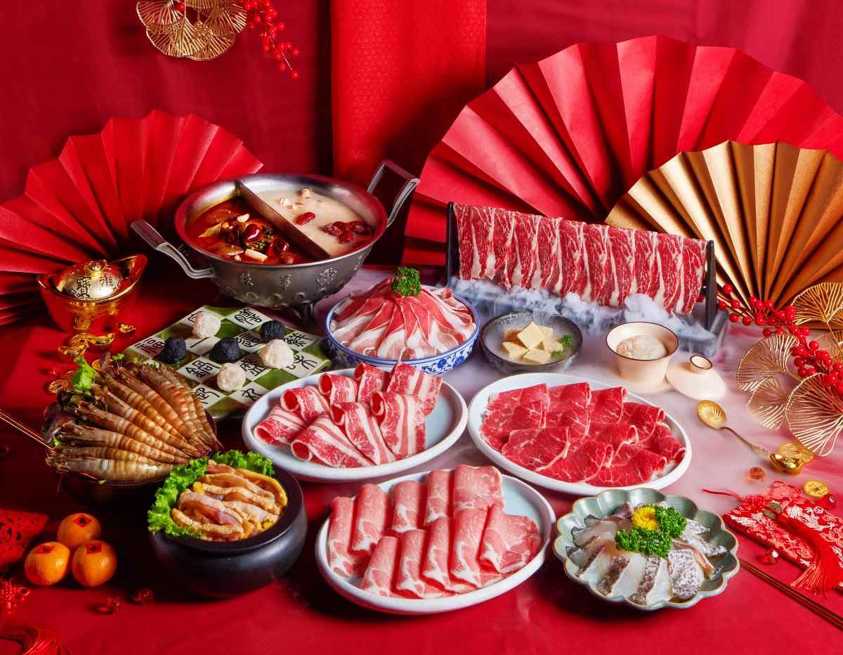 年菜套餐內容:湯底三選一、美國雪花牛肉、神仙牛肉、澳洲和牛板腱、美國板腱牛肉、台灣黑豚1983豬五花、梅花豬肉、台東鹿野雞腿肉、龍虎斑魚、草蝦、黑曜墨魚丸、鮮味花枝丸、干貝珍珠滑