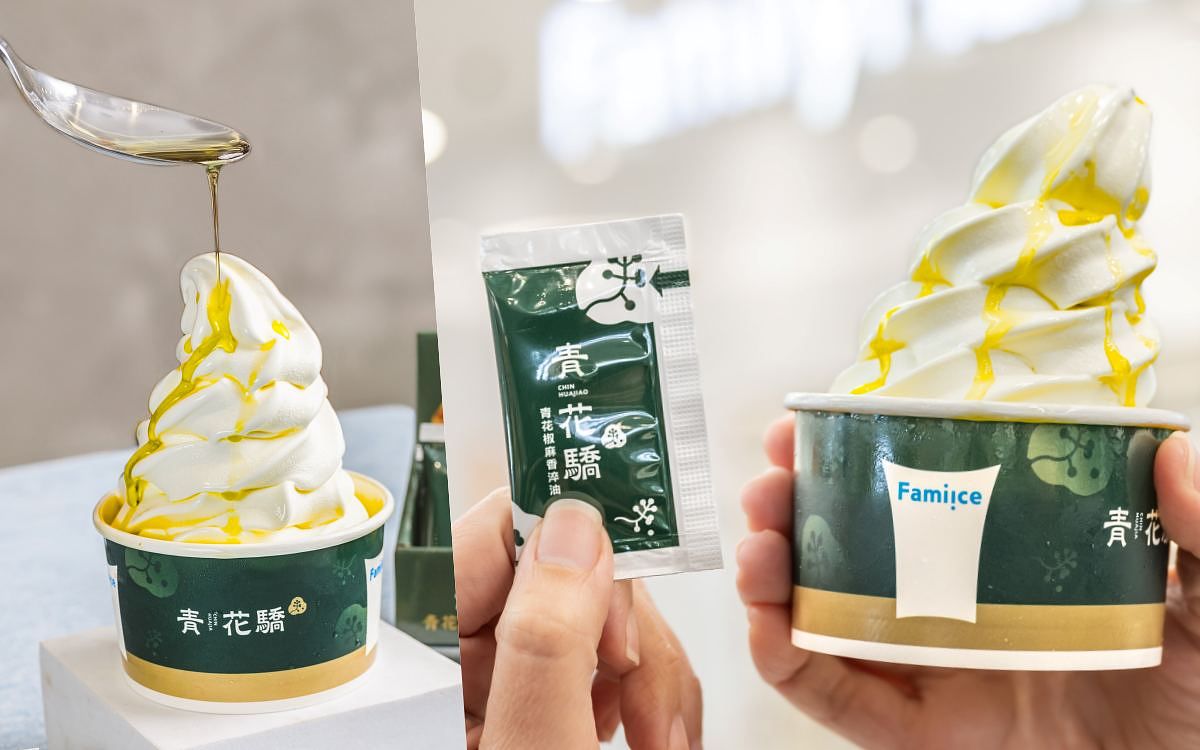 圖片來源:全家 1/5首波開賣「Fami!ce青花椒霜淇淋」,主打淋上以江津九葉青花椒提煉的「青花椒麻香淬油」,鮮、香、麻、甜綻放獨特椒麻風味,與Fami!ce全家霜淇淋完美結合,締造綿延入心的鮮麻尾韻,結合經典小農牛奶或比利時巧克力風味都別俱一番風味,更可搭配限量青綠色霜淇淋餅皮及專屬聯名霜淇淋紙杯,為生活再添儀式感,售價49元。