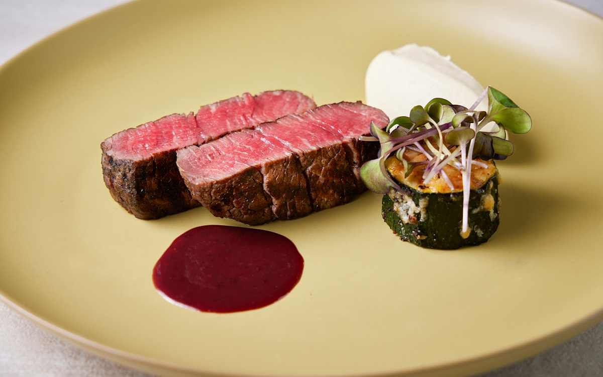 圖片來源:寒居酒店主菜則匯集11款經典人氣餐點,餐廳招牌「炭烤菲力、奶油白菜、白花菜泥、紅酒芥末醬」將油脂清爽口感軟嫩的厚切菲力牛排放入 Josper 烤箱直火炭烤至三分熟,表皮焦香,肉質呈現誘人紅寶石色澤, 入口瀰漫煙燻香氣。