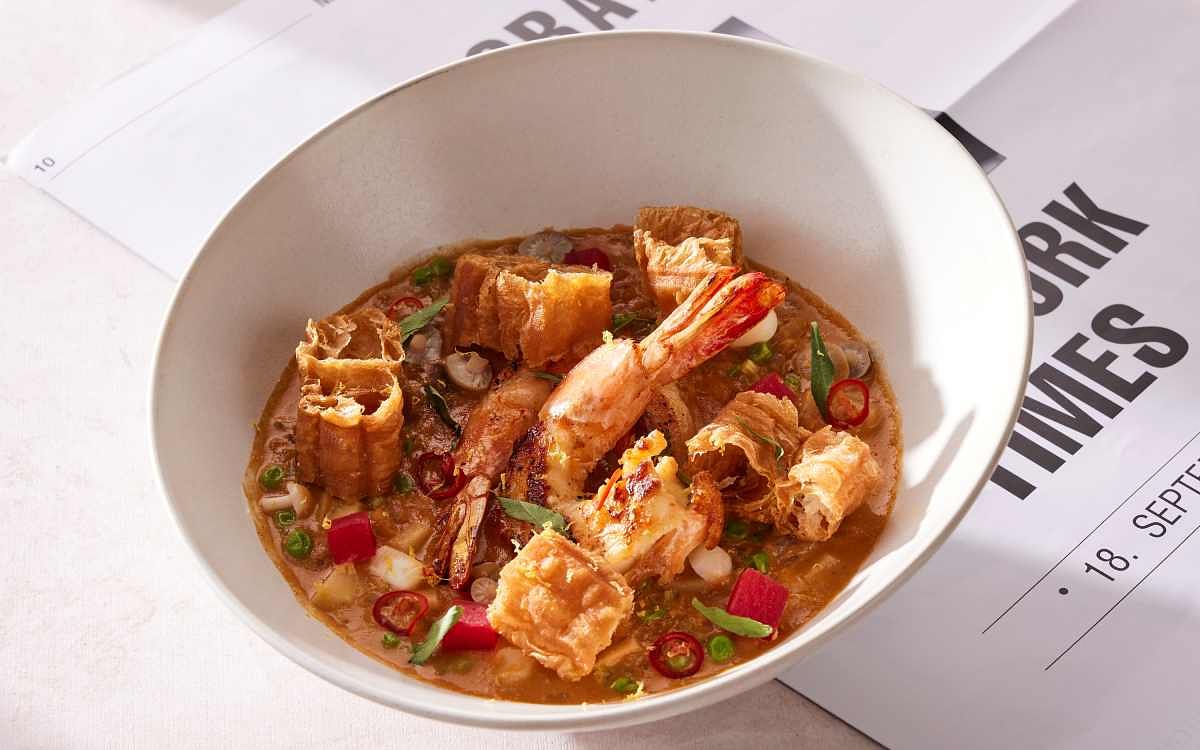 圖片來源:寒居酒店人氣熱賣「虎蝦海鮮粥、黑橄欖、帕馬森起司、羽衣甘藍」虎蝦頭及雞高湯細細熬煮出富有濃郁蝦子甜味的湯頭,再加入炒過的中卷丁、蛤蜊、醃漬美白菇與鴻禧菇等海鮮,將大海的鮮甜滋味濃縮進義大利米心。