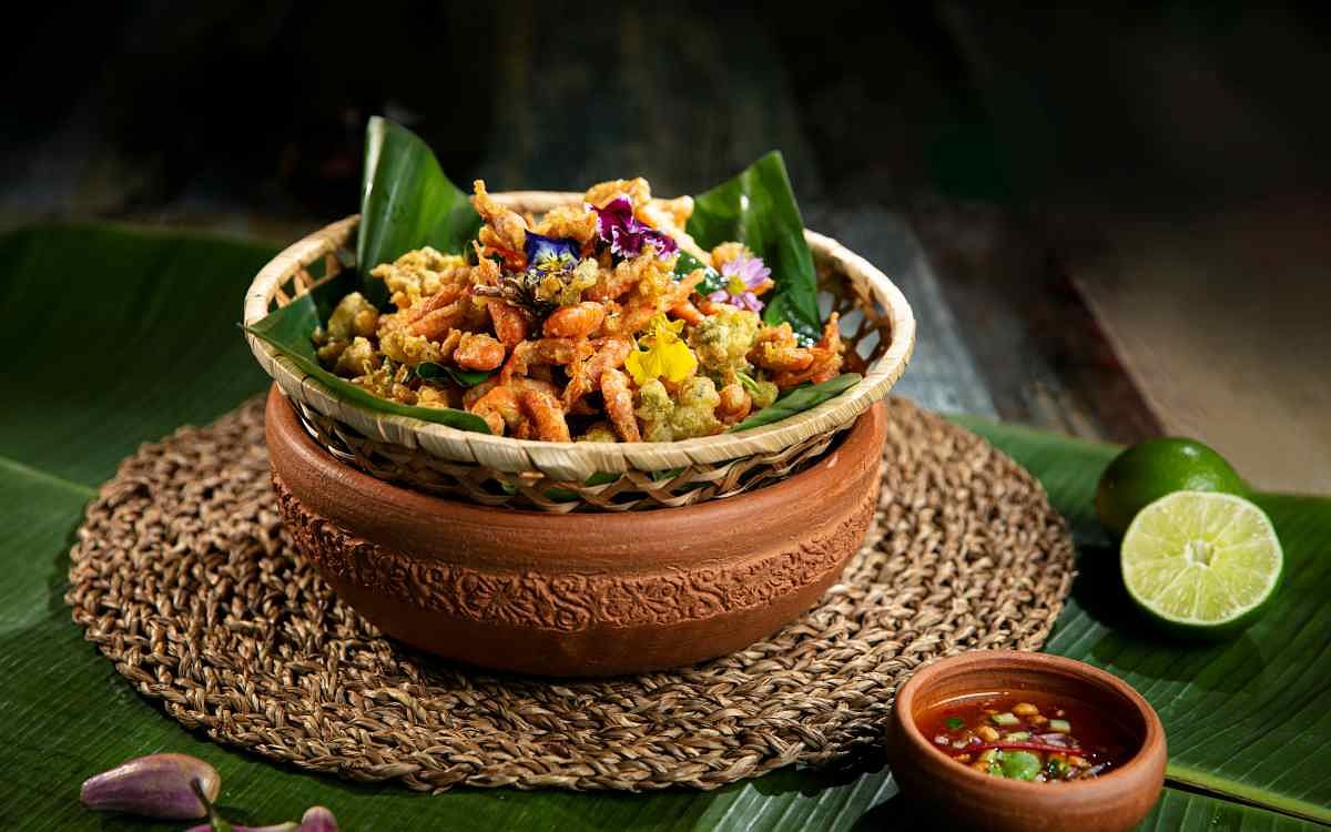 向來以台灣少見的泰北料理為主打的Thai J泰式料理餐廳,迎來2024年的龍年開春,帶來多道富有新年吉慶含義的泰式美味佳餚。外觀色澤金黃喜氣,藉以花團錦簇為寓意的泰式百花炸蝦/380元,以食用花點綴酥脆鹹香的酥炸溪蝦,搭配特調的醬料享用更顯酸甜開胃。同樣以蝦為主要食材的泰北鮮蝦肉末涼拌/380元,透過生菜包覆肉末、烤糯米的開胃吃法,展現其清爽。