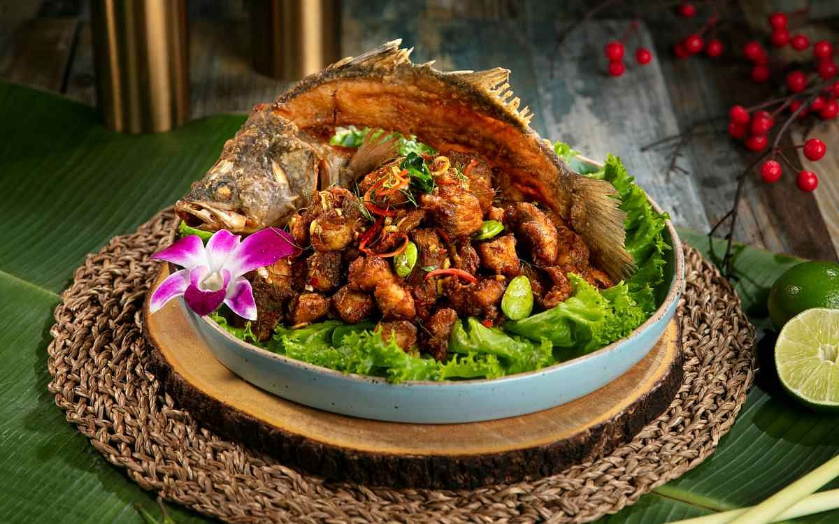 圖片來源:Thai J 同為年節帶來喜慶、富有年年有餘之意的香料咖哩炒鱸魚/580元,可見整隻鱸魚上桌,但鱸魚已片成方便入口大小,並以黃咖哩等多種辛香料炒製,其中更吃得到泰國料理常見、具有特殊發酵氣息的臭豆,則是整道料理的靈魂,值得一嚐。