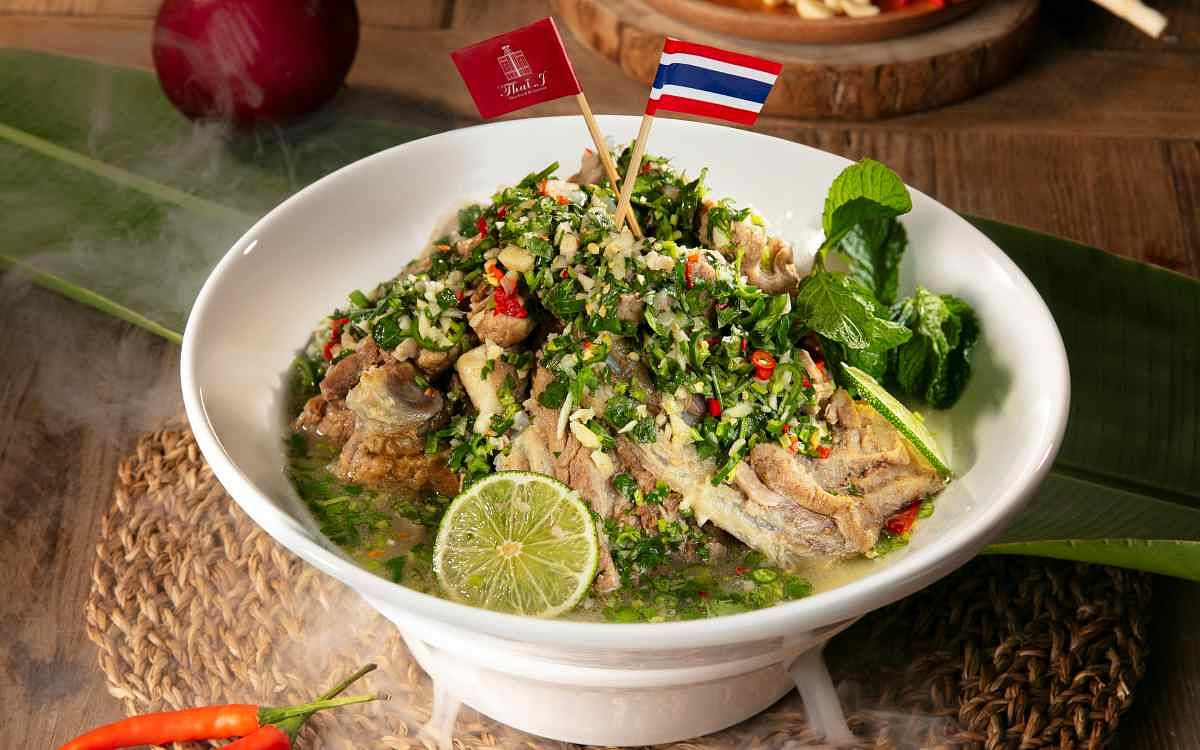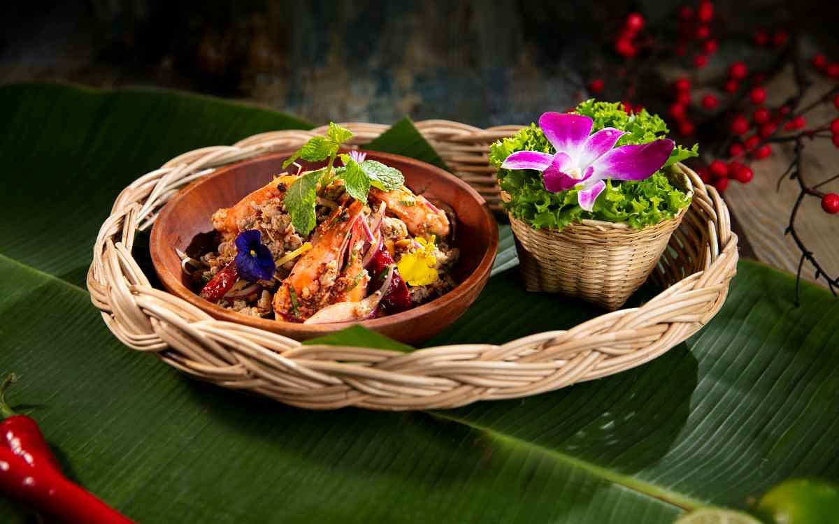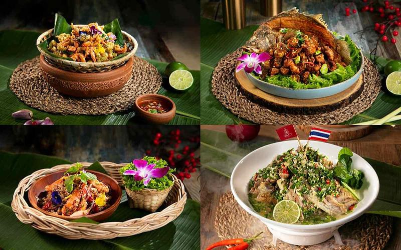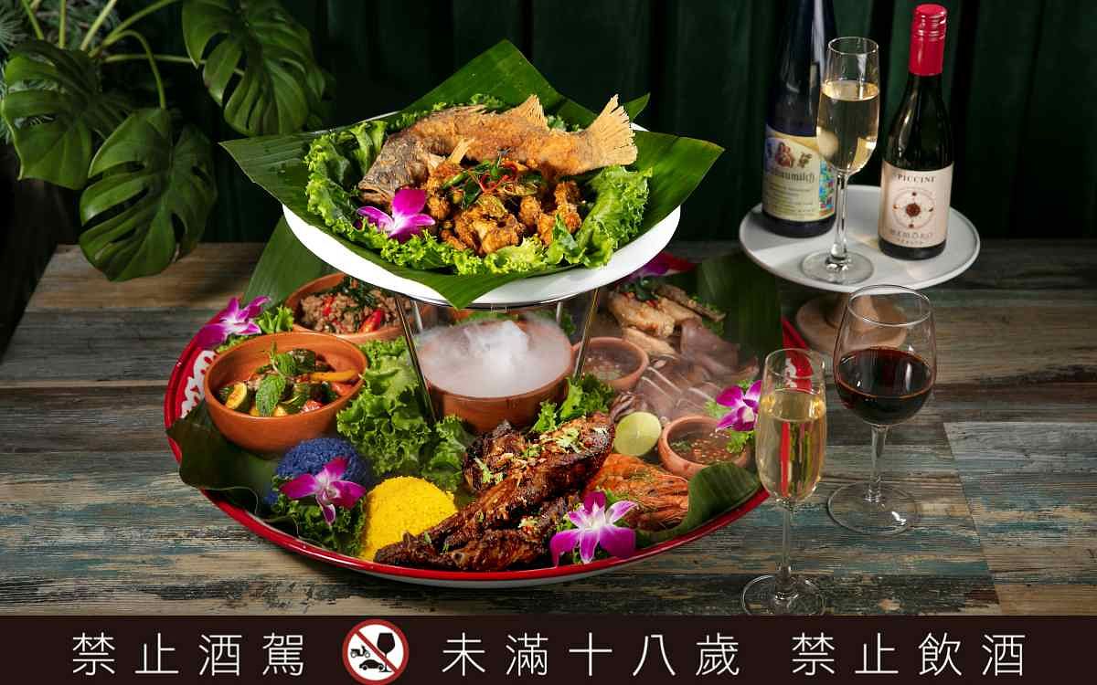 圖片來源:Thai J 霸氣上桌的宮廷皇室盛宴系列,泰國進口直徑高達60公分的底層大圓盤裡,匯聚涼拌菜、烤肉、海鮮、泰式香米等經典料理。開胃前菜有口感爽脆的泰式櫛瓜、青木瓜涼拌等時蔬,泰式料理必備的海鮮類:炙燒鮮魷、酸辣鮮蝦,也以自製的三味汁賦予鹹香酸辣風味。最令人欲罷不能的香爆豬肋排,則以每支平均長20公分的厚實肉量,在芫荽籽、花椒等調味添附下吮指回味。至於泰式料理餐廳必備的打拋豬,特別選用油脂分布8:2的豬腿肉製作絞肉,並以正統的打拋葉引領出獨特風味,別於台式常見的九層塔更具與眾不同。