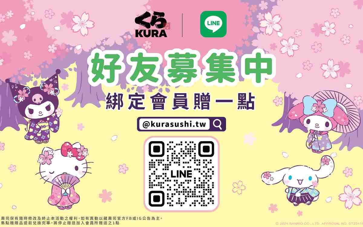 藏壽司台灣官方 LINE 帳號即將在1月16日正式上線!除了能提供各位藏友們最即時的藏壽司活動資訊外,還能透過帳號集三麗鷗開運集點贈,讓消費者隨時都能集點!現在只要加入藏壽司官方 LINE 並成功綁定會員即可免費獲贈一點,點數適用1/19起三麗鷗店鋪集點贈,各位藏友們趕緊加入吧!