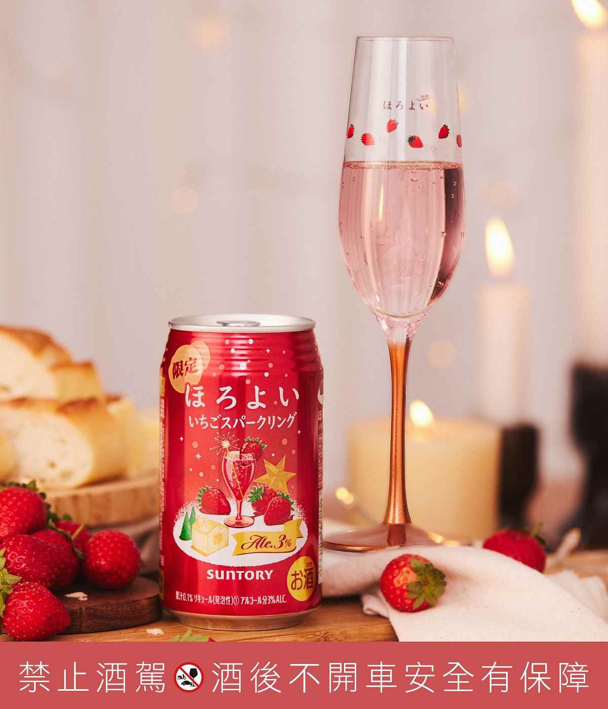 HOROYOI 微醉全新季節限定風味「草莓奢華氣泡」,以草莓果實的酸甜滋味,結合氣泡酒的清爽質地,打造出如香檳般清爽酸甜的浪漫風味,瓶身上則還有充滿冬季節慶的點心盤設計,超級可愛。