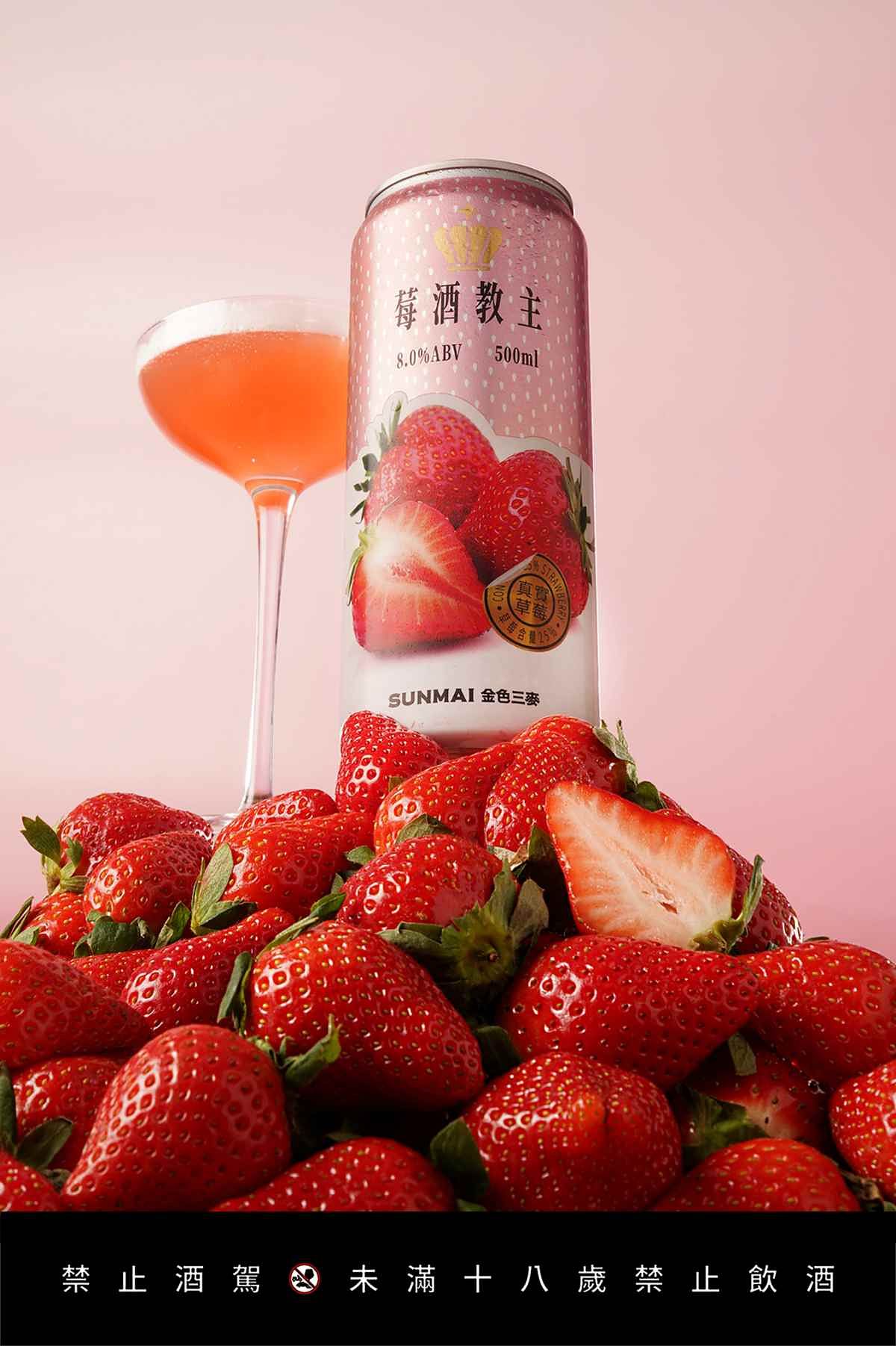 SUNMAI 金色三麥全新 2.0 版「莓酒教主」大手筆投入25%超高比例草莓,高達四分之一罐的天然果實成分,並以獨特的冷萃取技術保留天然水果的飽滿滋味。還有8%厚實酒精度,喝起來依然圓潤順口、沈浸微醺不自覺!