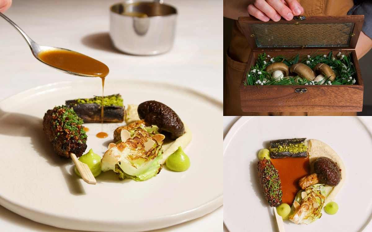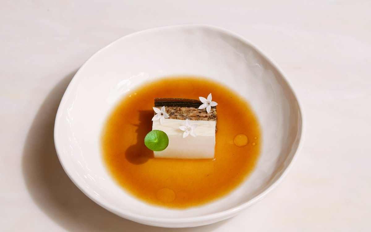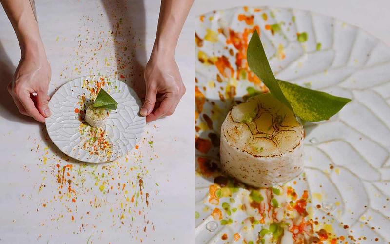 同樣以黑白色調來呈現無聲電影時代的作品,以較昂貴的食材如巴西蘑菇、羊肚菌、牛肝菌與較平凡的食材如蘿蔔、山藥,相互堆疊呈現,來比喻電影故事裡社會階層有極大落差的富豪與流浪漢,最後淋上老酒醬汁,象徵喝醉的富豪眼裡,所有人其實都是一樣的。其實料理也是如此,不管是什麼食材本質上都沒有貴賤之分,透過不同的手法與呈現方式,都是可以像賣花女一樣獲得新生的。