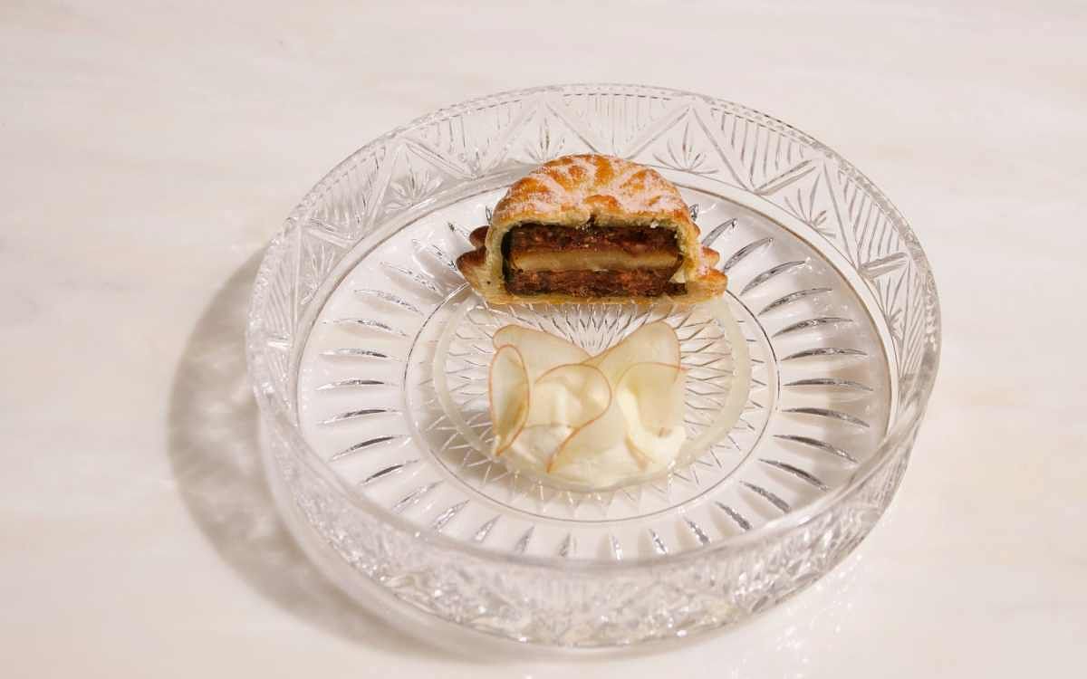 以「蘋果派」來致敬這部迪士尼經典動畫,故事中「蘋果」的存在是一重要元素,除了皇后想要用毒蘋果來殺害白雪公主,白雪公主與七矮人生活時,也一同手作了蘋果派。特別選用玻璃的器皿承裝,搭配透明的乳清醬汁來呈現「魔鏡」的高貴與夢幻。