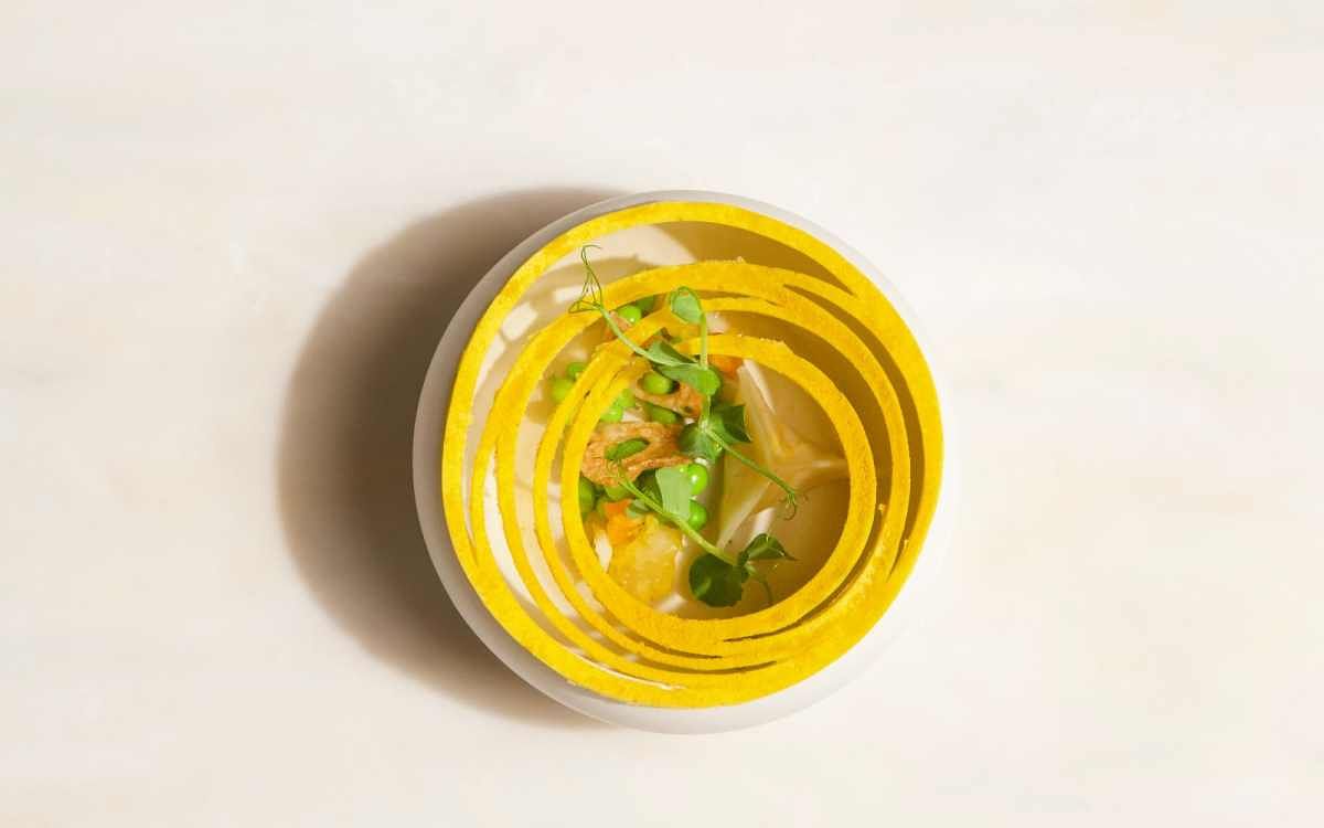 美國好萊塢黃金時代的彩色歌舞電影,整部影片充滿了豐富飽和的色彩,透過讓各種不同顏色以及風味的醬汁如雨滴般灑落在餐盤中,來營造出繽紛歡樂的氣氛,並以中心的白蘆筍與綠蘆筍脆片來致敬電影裡的經典場景 – 男主角撐著傘在雨中歡唱著關於愛情的喜悅。