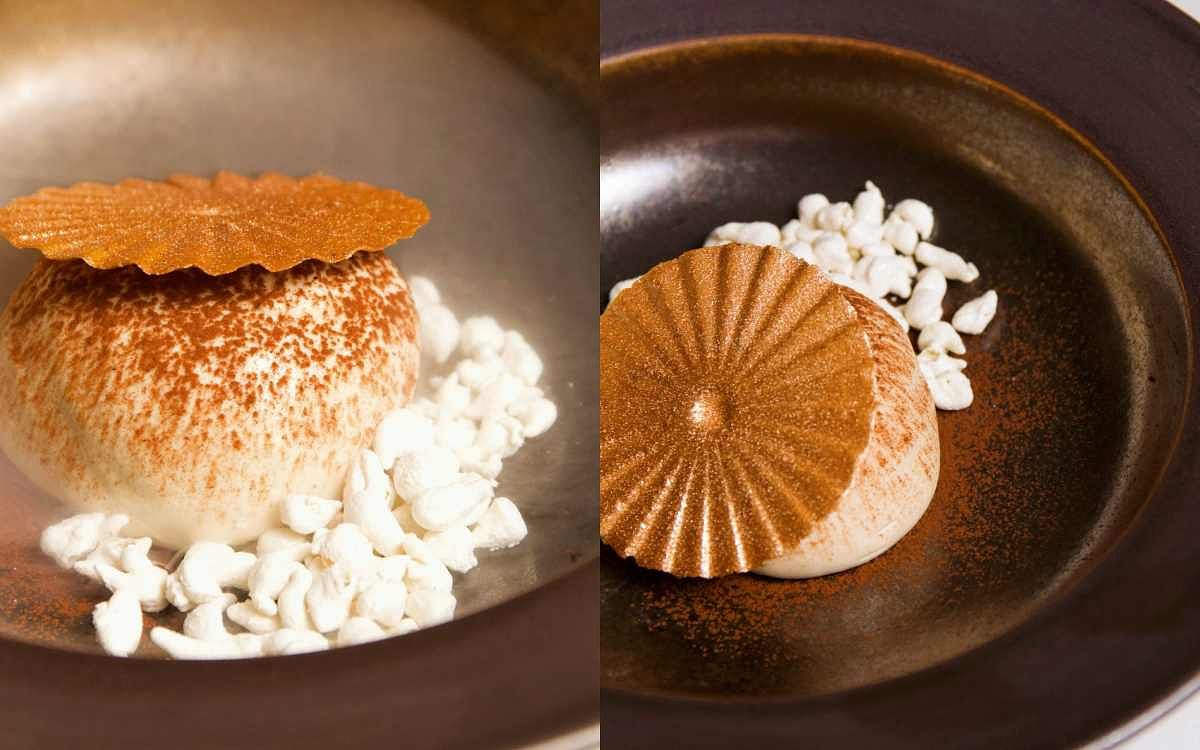使用義大利經典甜點提拉米蘇為基底做元素的堆疊,加入沙巴雍做成的蛋酒冰淇淋,佐以白色煙霧和金色閃耀的脆片,象徵著電影裡甜蜜浮華又放縱的生活。