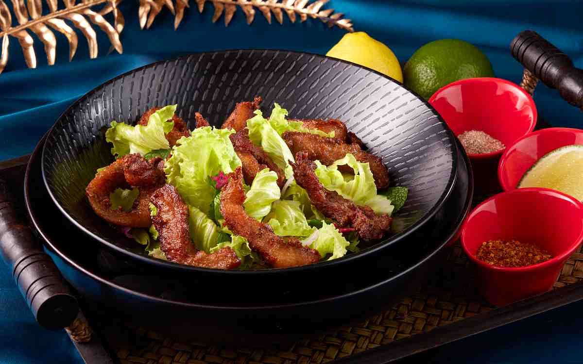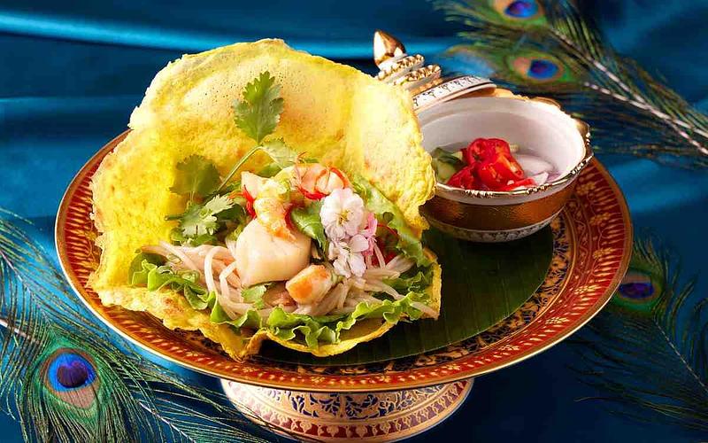 圖片來源:SUKHOTHAI SUKHOTHAI餐廳在迎來Jimmy主廚後,將重整既有菜色風味,口味上更趨於曼谷首都菜的圓潤,辣、甜、酸、鹹都不能過度。全新十一道料理從開胃菜、酥炸燒烤、經典海鮮、泰式熱炒到甜點皆有新花樣。開胃菜「脆皮松阪豬沙拉Moo Klook Foon」是主廚在曼谷英迪格酒店時獨創招牌菜,以東北伊善地區家喻戶曉的「炸豬頸肉Khao Moo Tod」為發想,運用當地特色炒米,配上辣椒、黃薑、檸檬葉等香料製成特製辣粉,與魚露、檸檬汁、砂糖等佐料,拌上炸至金黃酥脆的松阪豬以及生菜,爽脆生菜中和松阪豬的油香、醬汁酸辣開胃,不僅成為該酒店的招牌菜色,也多次登上媒體成為人氣名菜。