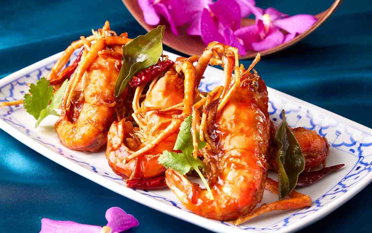 圖片來源:SUKHOTHAI 「鮮蝦干貝肉末沙拉」是Jimmy主廚將經典皇室料理食材升級,將酥脆米餅殼中盛裝與椰子粉、檸檬葉、蝦米一同拌炒的豬肉末,配上爽脆銀芽、鮮甜白蝦與干貝,再淋上泰式酸辣醬汁。海鮮料理最注重的醬汁主廚以三種自製風味呈現「羅望醬」以新鮮羅望子乾與魚露、檸檬汁、香茅、南薑一同熬煮,濃郁酸甜帶有香茅清香。「三味醬」以酸、辣、甜三味為特色,以羅望醬、洋蔥、辣椒醬、紅辣椒等近十種香料熬煮後,加入毛豆仁、洋蔥、紅、黃椒丁及九層塔提鮮。另外「綠胡椒蘿勒醬」則是主廚獨創醬料,以新鮮的綠胡椒、蒜頭、洋蔥、紅辣椒炒香後熬煮收汁,風味香辣濃郁,綠胡椒清香搭配海鮮更為清爽,三款醬汁均可自由搭配時令鮮魚、龍蝦或泰國蝦一同享用。