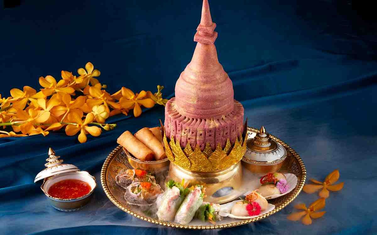圖片來源:SUKHOTHAI Jimmy主廚說宮廷泰菜與泰國中部美食有著不少相同之處,食材多元新鮮、口味偏甜,但更加講究色香味與風味平衡。宮廷菜裡「擺盤」是呈現餐點的重要因素,以蔬果雕刻為重、需要長時間的練習與耐心,全憑手藝的穩定度達到華麗精緻的視覺效果,也是百年傳承的泰國飲食文化。Jimmy主廚在料理上特別著重「美色」,精美的雕刻與鮮豔的色彩是他認為泰菜吸引人的第一要素。求學時期的專業訓練與飯店歷練讓他的菜獨具色彩,如全新菜色「暹羅綜合盤」印入眼簾是主廚以鹽雕手工製作成泰國著名的「瓦」形佛寺,配上四款前菜「帝王蟹時蔬捲、北海道干貝鮭魚卵、酸辣鮑魚、酥炸龍蝦肉捲」,不僅吸睛更是美味。