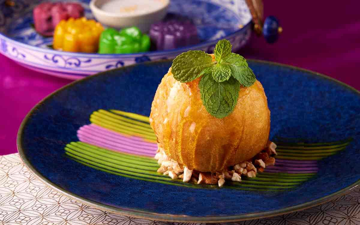圖片來源:SUKHOTHAI 甜點的部分Jimmy主廚更拿出看家本領「斑蘭糯米椰汁甜湯」是出自於泰國皇室的甜點,只有在泰國的吉祥儀式或節日上出現,將糯米做的湯圓皮中包入炒香椰子粉與椰糖,搭配以椰奶、椰子水、斑蘭葉等食材熬煮成的溫熱甜湯一同享用。「手工酥炸冰淇淋」則是主廚以泰國普吉島常見的油炸冰淇淋為靈感,以磅蛋糕碎包裹香草冰淇淋,沾裹椰奶、芝麻及椰子粉等磨製的酥炸粉一同油炸,淋上香甜蜂蜜及腰果碎,冰火交融雙重味覺饗宴。「綜合甜點盤」以在來米粉、椰子粉等七種食材,透過泰式工法製成彩色彈牙年糕皮,包含「香蕉黑豆、南瓜甜玉米、斑蘭葉甜玉米、芋頭紫米」四款道地風味,搭配香甜椰奶醬,感受豐富滋味濃縮口中的味覺饗宴。