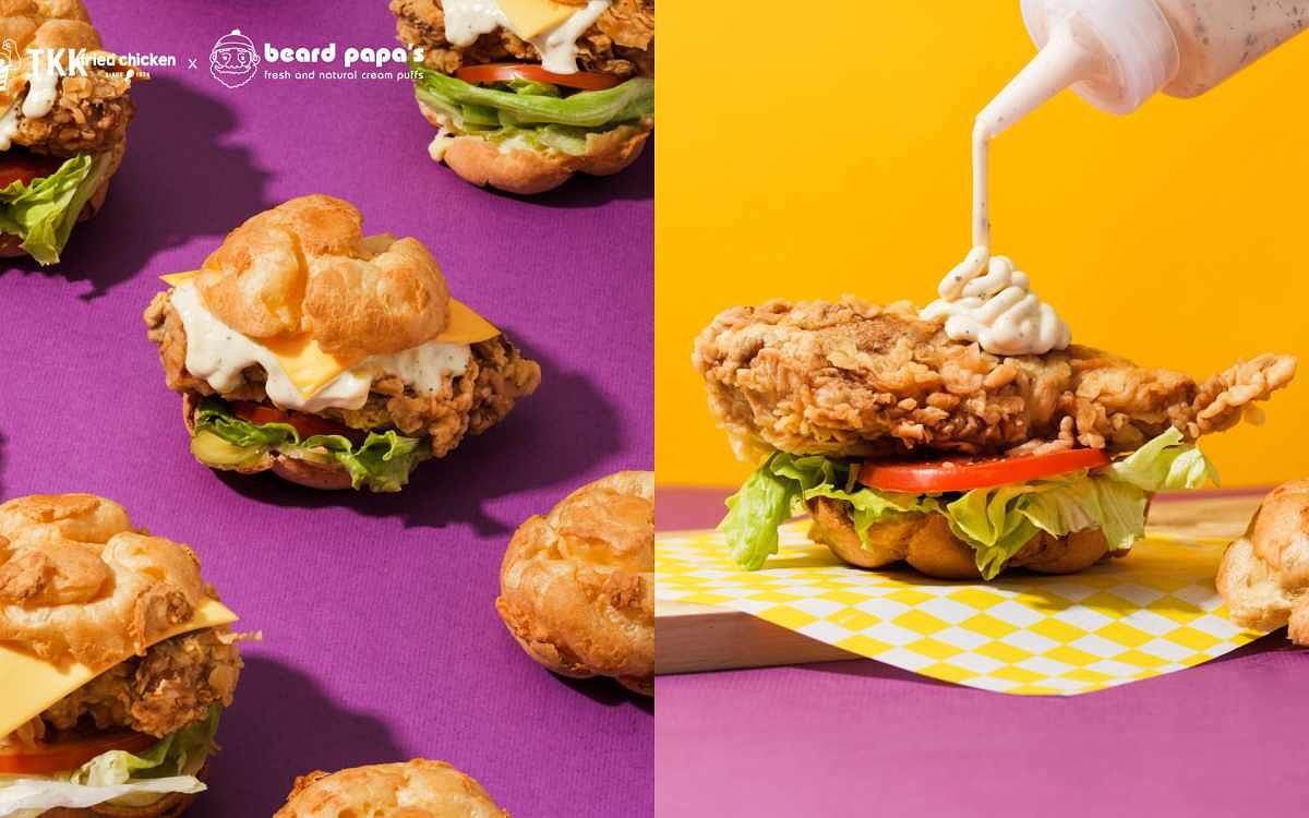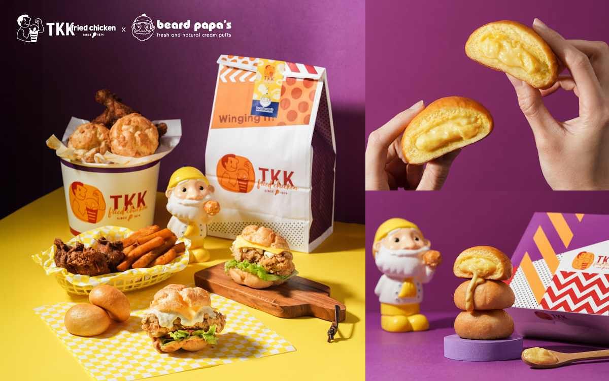 圖片來源:beard papa’sbeard papa’s與台灣第一家連鎖炸雞品牌-頂呱呱首度聯名啦!同樣堅持食材新鮮與美味的理念所共同研發推出「卡士達甜甜包」,是由頂呱呱的人氣單品-金黃色的甜甜包搭配beard papa’s卡士達內餡的最強組合,奶香滑順不甜膩!另外還推出「田園卡士達炸雞泡芙堡」,在beard papa’s招牌日式泡芙皮中夾入頂呱呱超厚實炸雞、特調田園卡士達醬與新鮮時蔬,顛覆你對漢堡的既有印象!