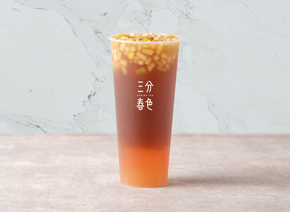 茉莉花綠茶加上蘋果丁打成的顆粒冰沙,再加入櫻花寒天豐富口感,上層還點綴了入口綿密、口感細緻,並且帶有起司鹹口味與蘋果果香的特製奶蓋,先品嘗到濃郁細緻的奶蓋口感後,清新甘醇的茶湯清爽呼應。