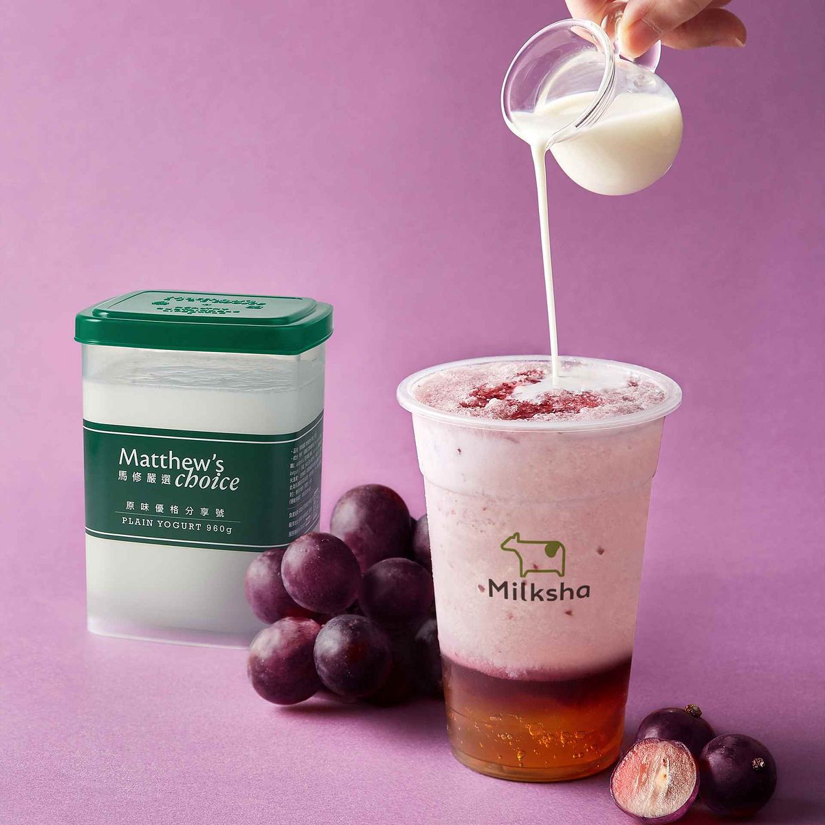 再度攜手台灣優格第一品牌-馬修嚴選,推出葡萄口味酸甜優格冰沙飲。在巨峰葡萄冰沙加入綠光鮮奶,再搭配馬修嚴選優格和綠茶凍,一杯飲料就含有億級活性乳酸菌,口感綿密柔順。