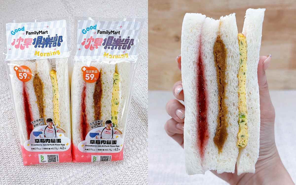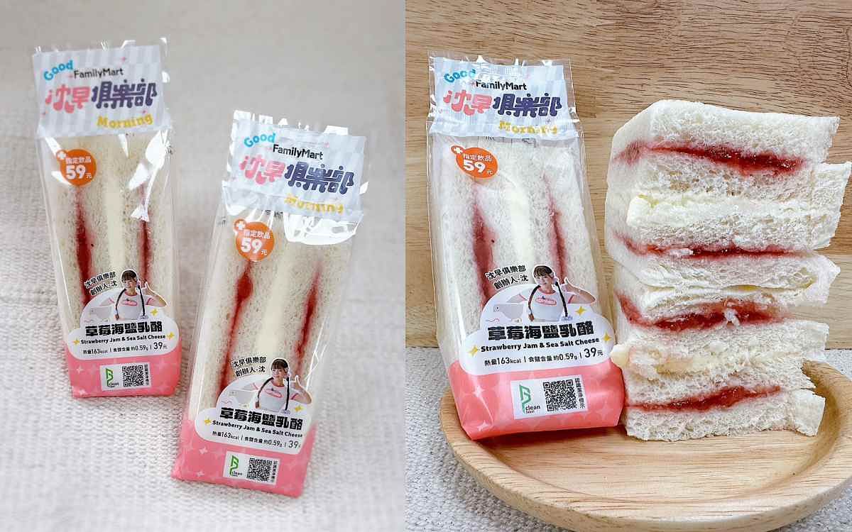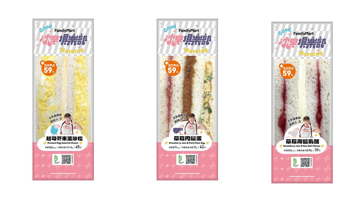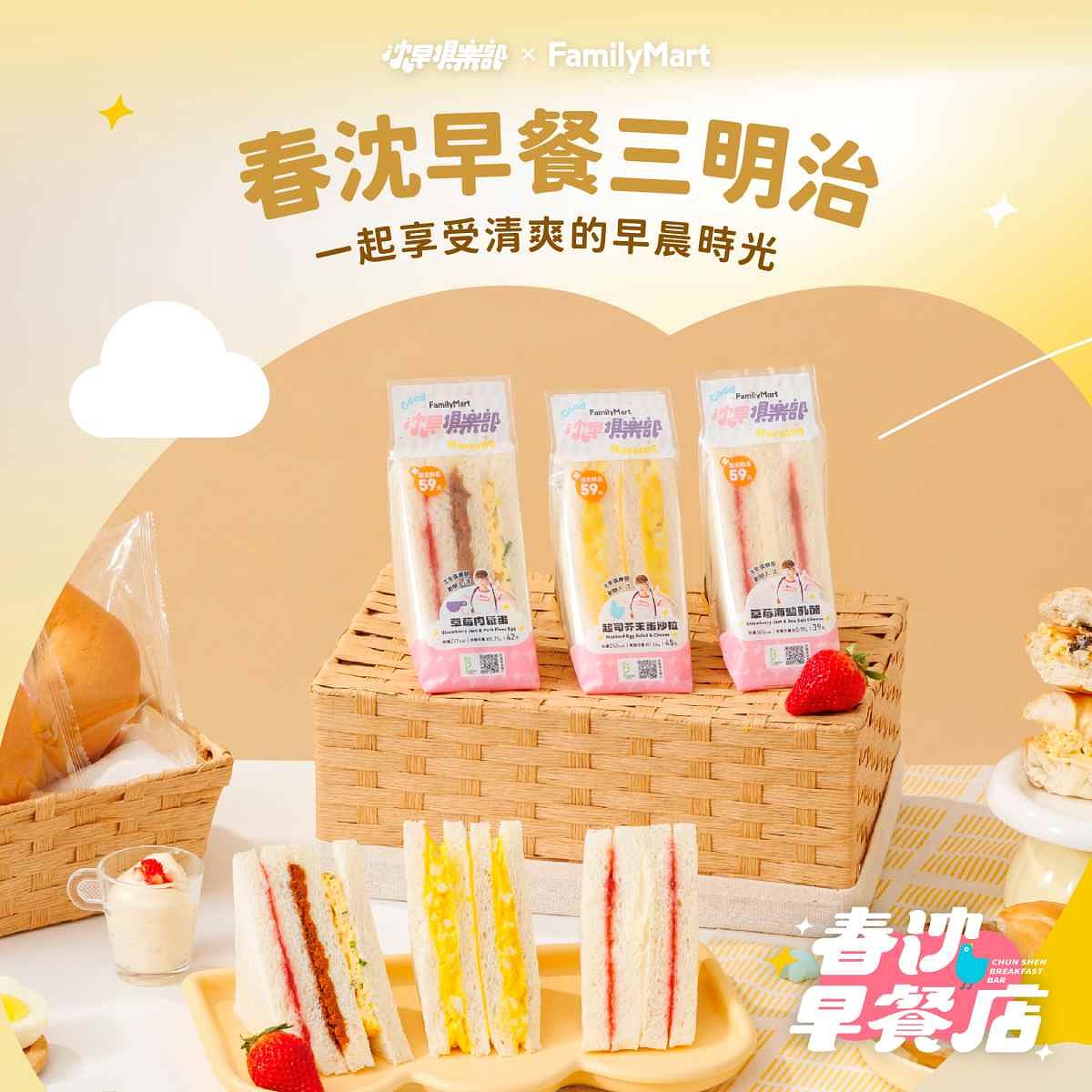全家便利商店與沈早俱樂部聯名推出的三明治共有三款特色口味,首推的「草莓肉鬆蛋三明治」,復刻早餐店隱藏菜單,將草莓果醬與肉鬆大膽融合,搭配古早味烤蔥蛋打造多層次鹹甜滋味。「起司芥末蛋沙拉三明治」嗆辣清爽的芥末雞蛋沙拉,「草莓海鹽乳酪三明治」以酸甜草莓果醬搭配鹹甜海鹽乳酪,打造吃不膩的好滋味。