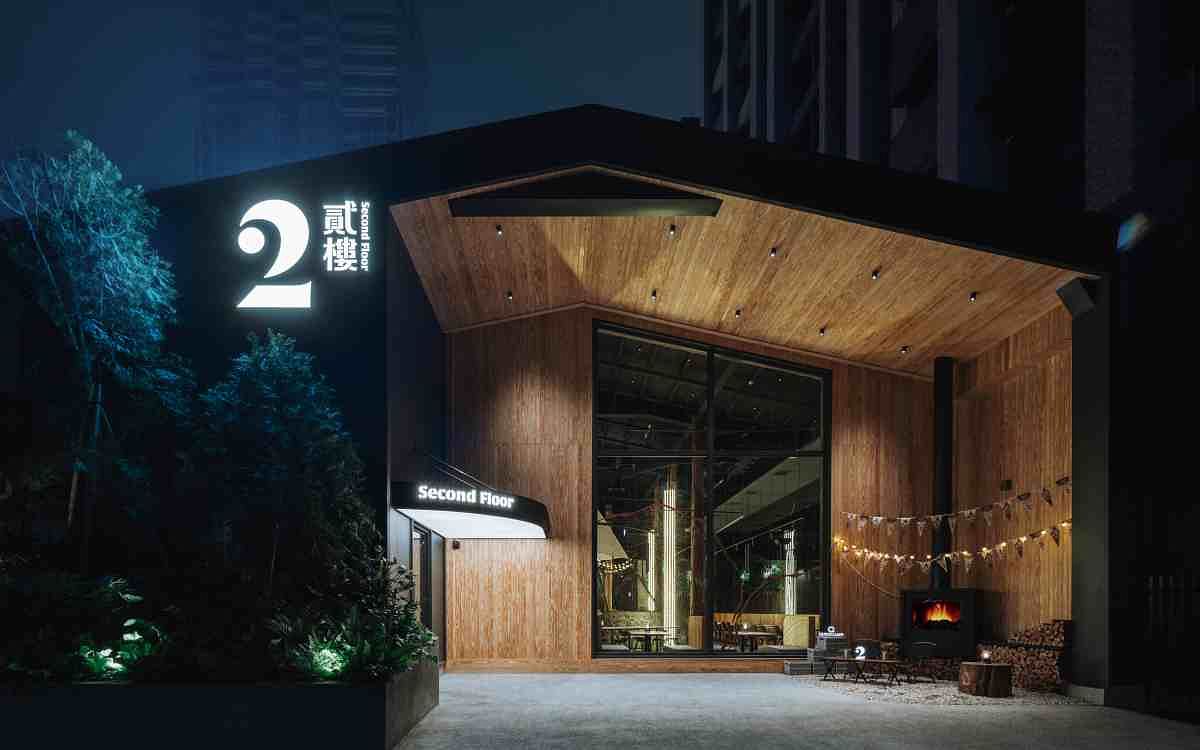 遠離擁擠的都市中心,貳樓林口店獨棟門店隱身於住宅中幽靜小巷,猶如一座山中木屋,在林口霧都更顯遺世而獨立。入口處大面落地玻璃設計,搭配木紋年輪造型的窗貼,延伸視覺深度,圍繞著木屋的落雨松,整體增添神祕感氛圍。貳樓林口店特別與日本露營風格品牌《Quick Camp》攜手合作,衍伸露營的概念,入口戶外等候區以三角旗幟、戶外燈串、搭配營燈與碎石地面,融入美式風格的壁爐設計,帶出經典的美式風格,並陳列露營蛋捲桌及露營摺疊椅,讓客人進入門店用餐之前,就可以感受到露營帶來的輕鬆愜意。Quick Camp簡約又舒適的設計,貫徹其品牌延續生活細節,從日常實現戶外活動的精神,讓回憶伴隨著美好更加持久,與貳樓希望將美好帶給每位消費者不謀而合。