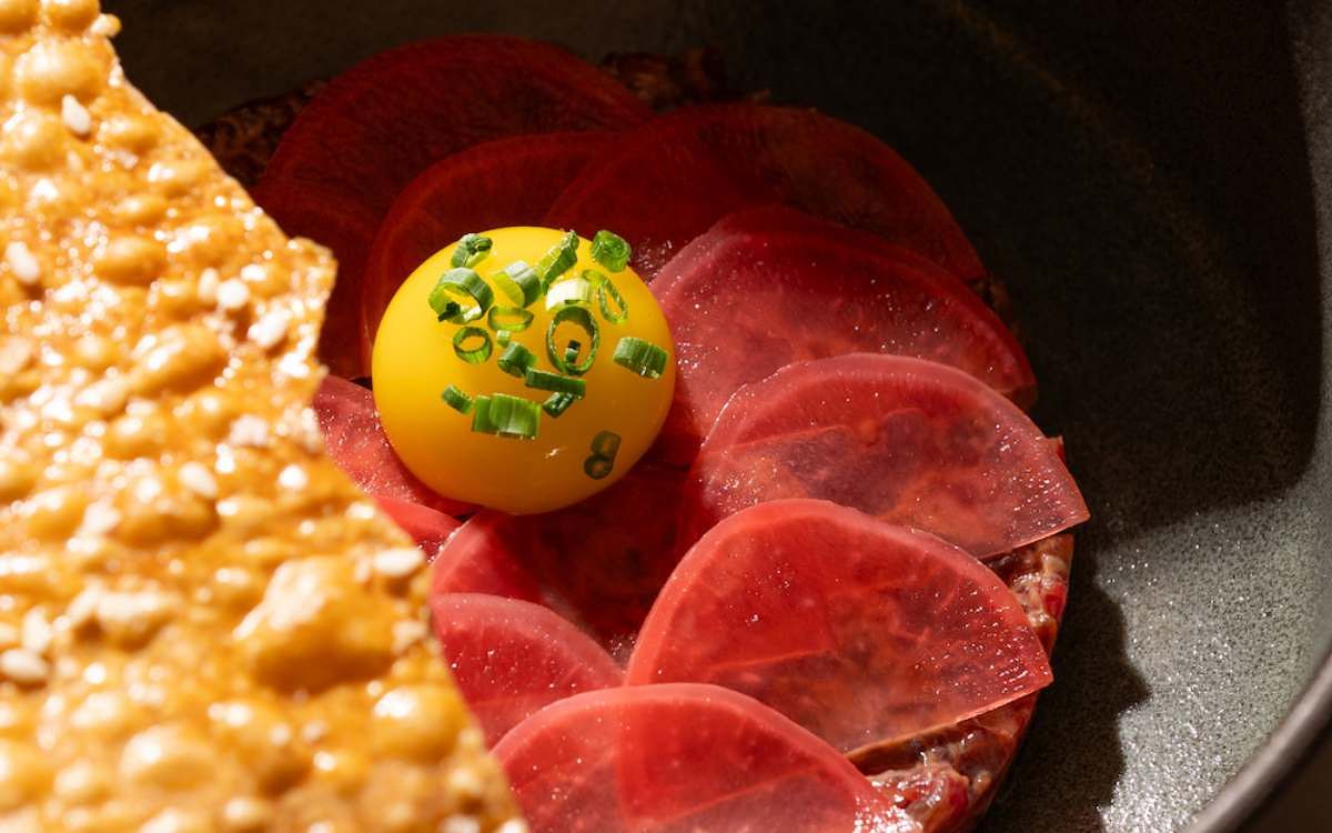 煙燻牛肉塔塔 赤味噌美乃滋/漬櫻桃蘿蔔/鵪鶉蛋/芝麻脆片 $450