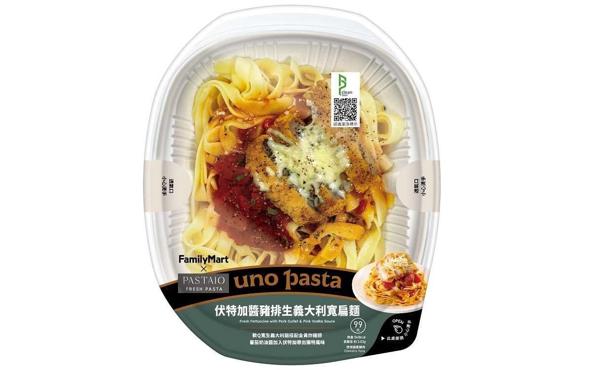 圖片來源:全家便利商店uno pasta X PASTAIO-伏特加醬豬排-生義大利寬扁麵 NT$99