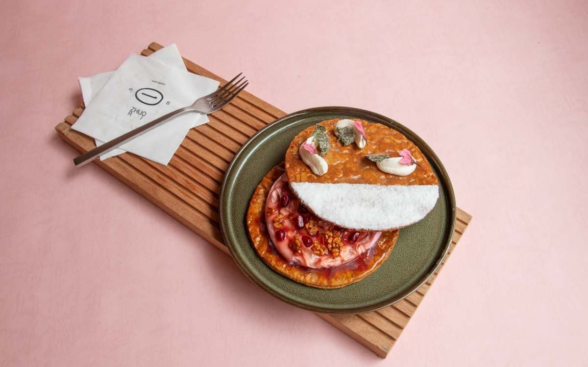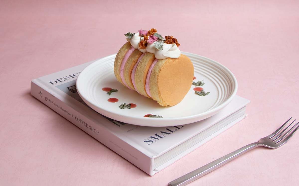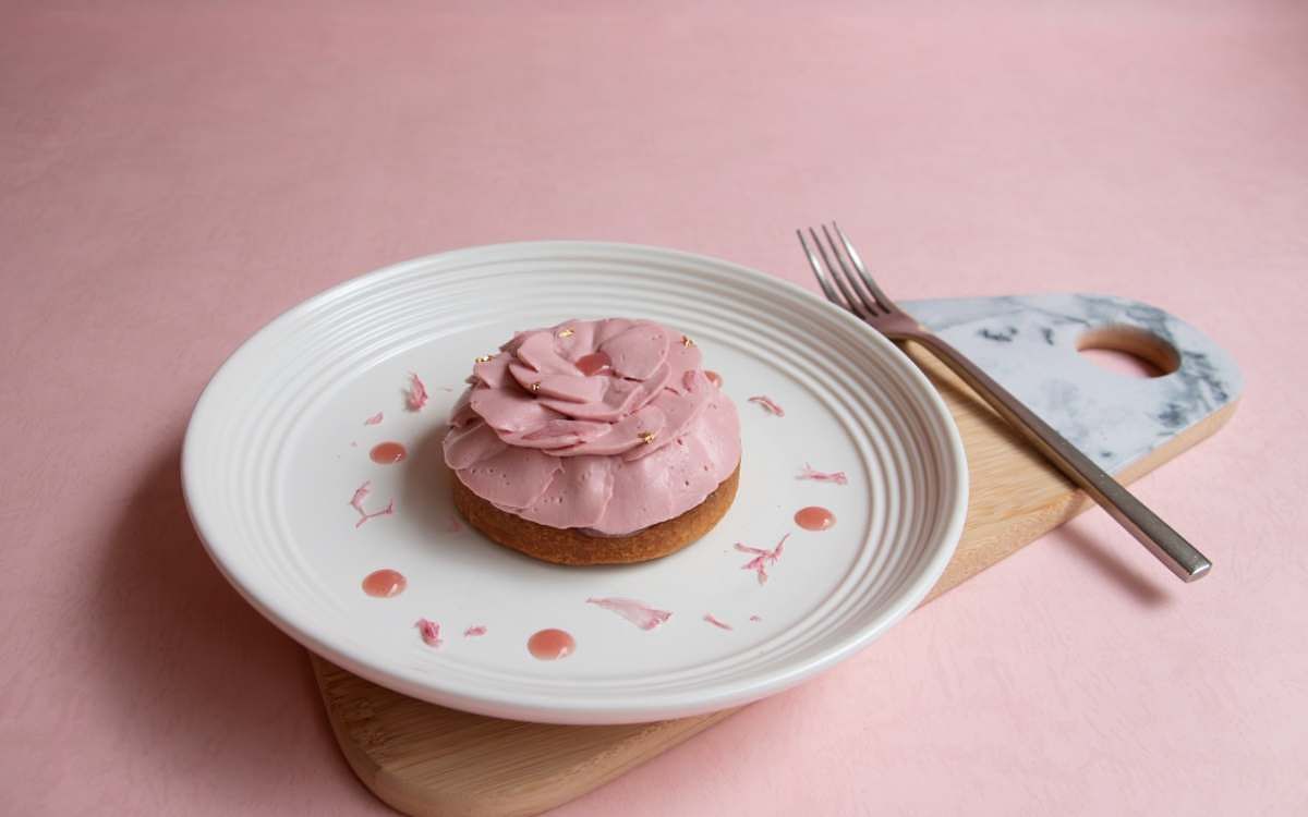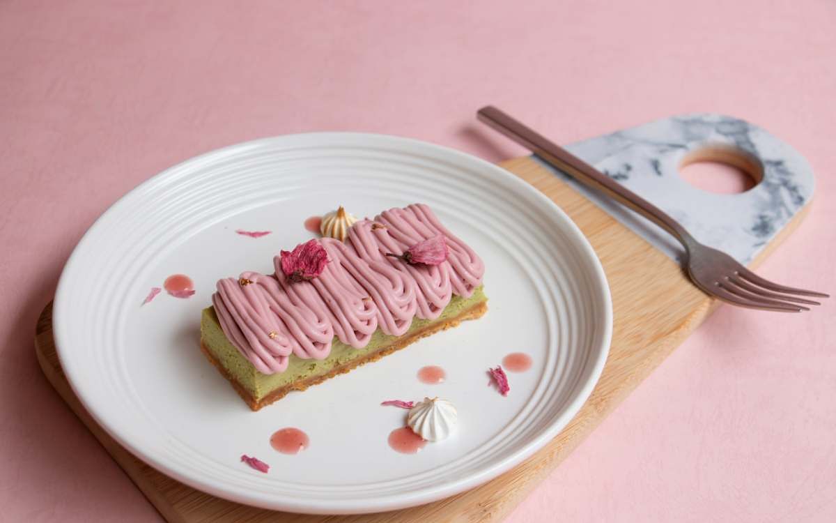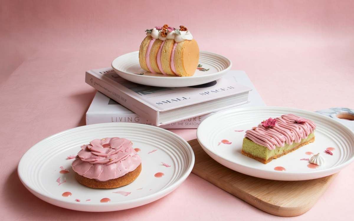 圖片來源:勺日ZHUORI「櫻花豆乳戚風」延續了勺日甜點的減法特色,鎖定輕熟女口味,特選口感濃郁但低甜度的豆乳製作成戚風蛋糕,車輪狀切片蛋糕夾有一顆顆晶瑩石榴,最後再以鹽漬櫻花與玄米餅裝飾在蛋糕體上,呈現出日式復古又可愛的風格。「春櫻抹茶起司蛋糕」則在苦甜抹茶起司蛋糕擠上櫻花醬,並以金箔與櫻花瓣妝點,讓人彷彿一秒來到日本。