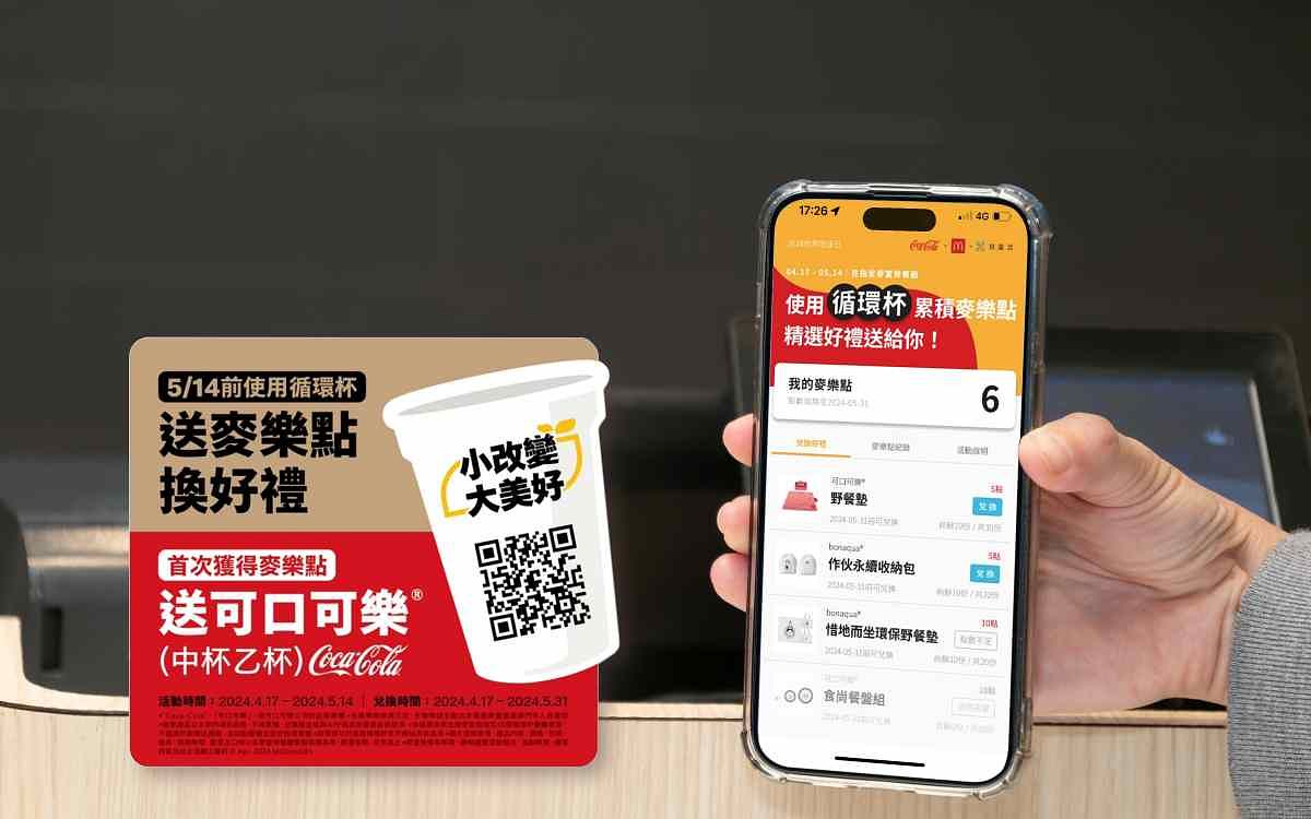 圖片來源:麥當勞 除了透過倡導舉杯之勞做環保好簡單之外,麥當勞亦與長期合作夥伴可口可樂公司再度合作,只要於4月17日至5月14日期間,至循環杯租借服務的麥當勞餐廳借杯購買飲料,並在期限內歸還循環杯,就能免費獲得中杯可樂®兌換券一張;今年更加碼集點活動,租借即獲麥樂點數1點,5點以上即可獲得限量野餐墊、收納包或餐盤組等獨家好禮,一起為環境永續盡一份心力。