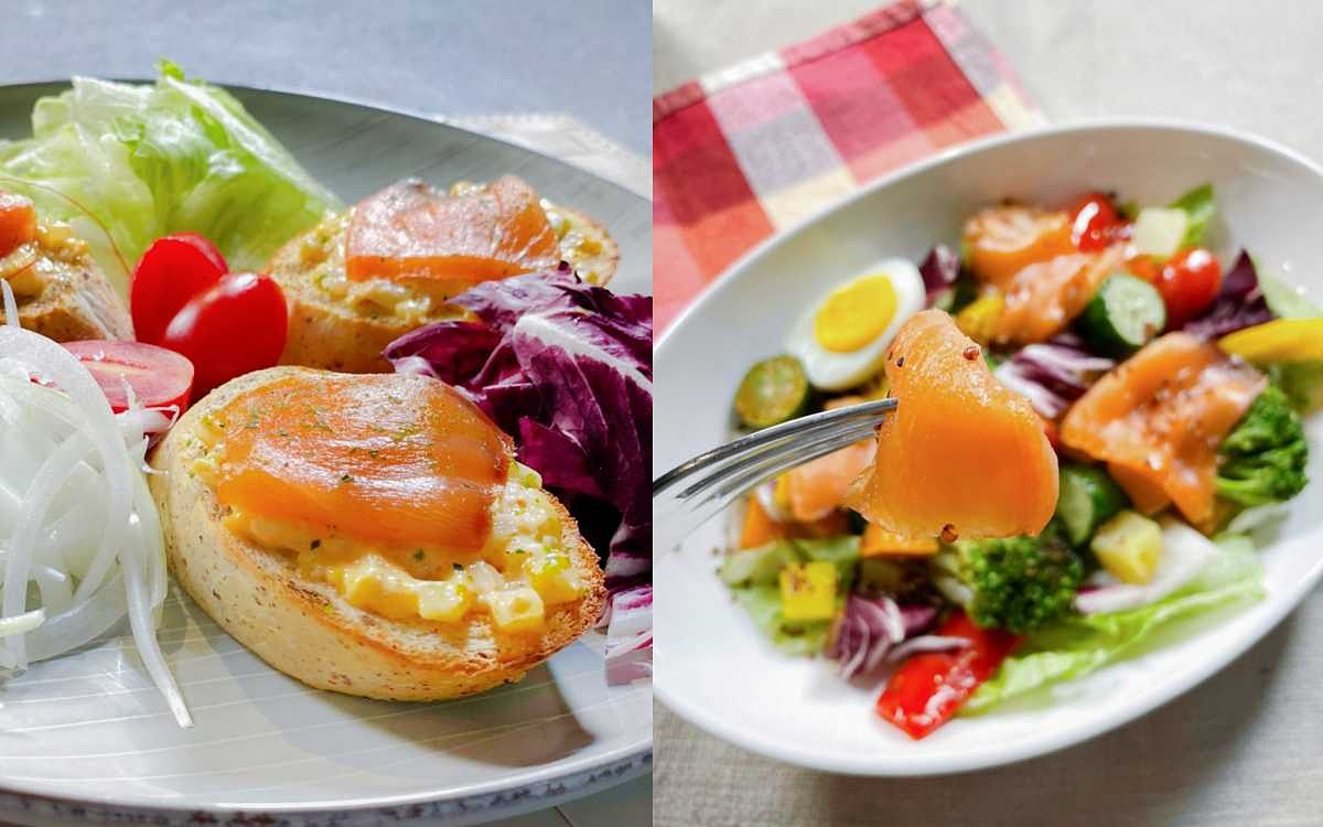 圖片來源:美威鮭魚 此外,春暖花開之時,美威鮭魚提供健康滿分、適合野餐享用的「煙燻鮭魚凱薩沙拉」(定價278元),燻鮭鹹香搭佐酸甜綿密凱薩醬,配上卡滋卡滋香烤紅藜麥軟法,是道清新健康的必嚐輕食!號稱10種鮮美蔬果盡收一盤的「煙燻鮭魚溫野菜沙拉」(定價278元),融合主廚特製橄欖檸檬香油醋酸甜入味,讓您輕鬆攝取滿滿Omega-3與膳食纖維!另端出色、香、味誘人的「明太子燻鮭塔帕斯」(定價160元),將西班牙開胃小食的「Tapas」賦予新意,鬆軟Q彈的紅藜麥軟法鋪上鹹香明太子蛋沙拉炙燒添香,搭上豐厚鹹香的燻鮭魚片,咬下一口,味香迷人,與明太子的加乘滋味層層釋放。「燻鮭春捲」(定價158元),一上桌即讓人眼睛為之一亮,將生食級鮭魚以冷燻鎖住飽滿鮮嫩的鮭魚肉汁,搭配捲起春捲皮、鮮脆美生菜、紫包心、洋蔥等鮮美食材,無論融合泰式酸甜醬或和風胡麻醬都恰到好處,滋味豐潤卻不油膩,是道清爽開胃的美味一品!「燻鮭冷盤」(定價140元),清爽開胃的檸檬汁將燻鮭的鮮度襯托得更加鮮香,佐上洋蔥絲,成就絕佳的味蕾和諧。