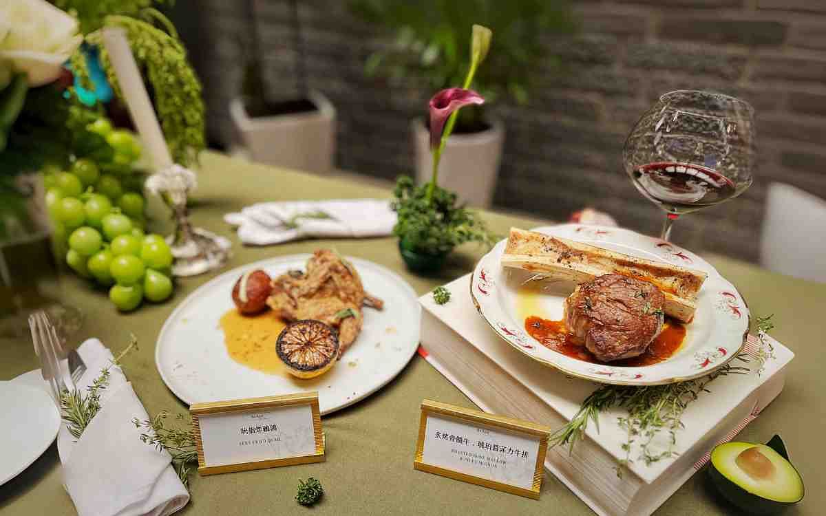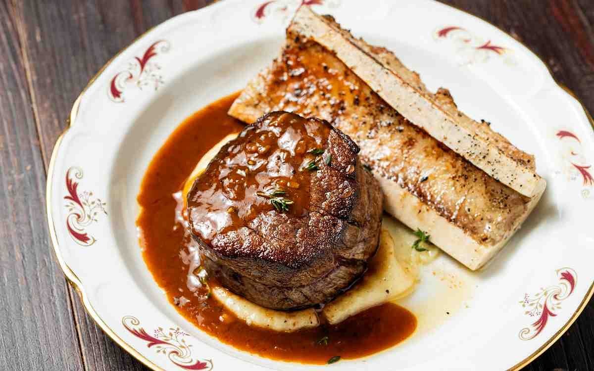 原汁原味將法式傳統菜裡牛骨髓與牛排的搭配重現,蘊含豐富的脂肪與膠原蛋白的牛骨髓,經大火炙烤後,釋放出的油脂焦香擁有其他食材無法取代的獨特深邃風味。精選無筋極嫩的頂級紐西蘭菲力心,大火先煎後烤鎖住鮮甜,三分熟度更能吃出它的純淨風味,桌邊再淋上熱騰騰的威士忌琥珀濃醬,讓醬汁中的威士忌酒香與牛油脂香融為一體。