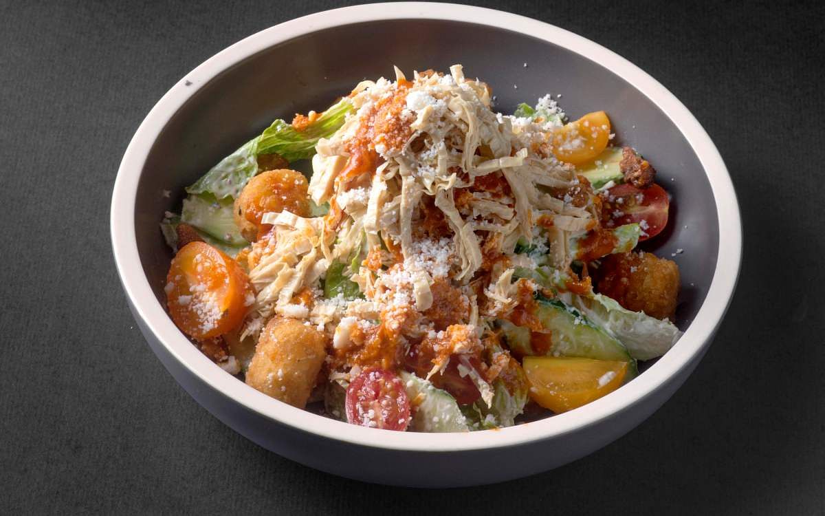 除了台灣小吃的元素,foldie這次的新菜也折疊了中西日韓等多國料理,持續創造蔬食的無限可能!「口水雞凱薩沙拉」這是一道中西合璧的創意菜餚,以凱薩沙拉為基底,特別使用薯球取代麵包丁,增加香氣。軟嫩的豆皮絲加上口水雞辣醬,帶有微微花生香氣,混合辣油及辣渣的香辣滋味,拌在一起食用更順口。