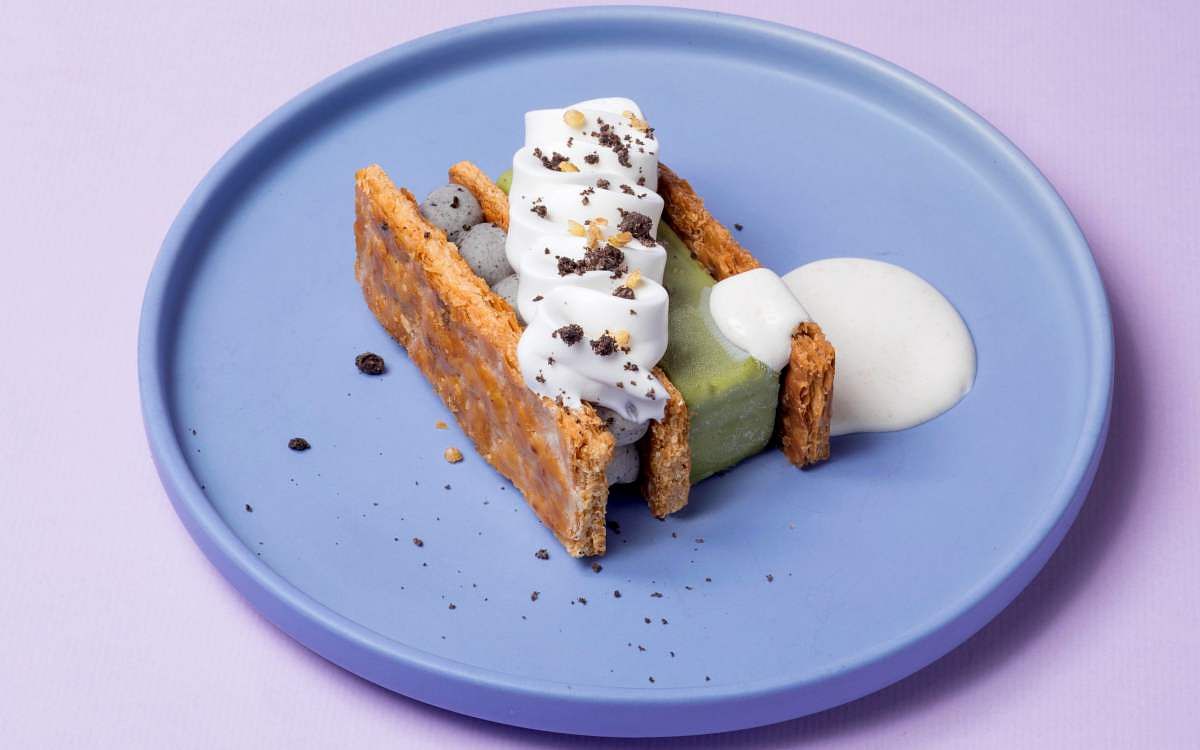 foldie人氣最高的甜點就是金沙斑斕芋泥千層,今年夏天推出全新口味「客家擂茶千層」,將客家擂茶解構,微苦微甜的抹茶冰淇淋及濃郁的芝麻奶油乳酪夾入法式千層中,佐以滑順的花生鮮奶油,點綴著蕎麥脆粒增添香氣及口感,茶香與芝麻香完美結合,每一口都是極濃享受!「紅酒洋梨橄欖油冰淇淋」將洋梨塔解構再折疊,洋梨泡過紅酒後酒香更加凸顯洋梨的甜味,搭配自製的橄欖油冰淇淋,滑順又扎實的起司蛋糕口感卻帶有香草味,再搭甜香的白巧克力酥餅,三種口感卻越吃越順口。
