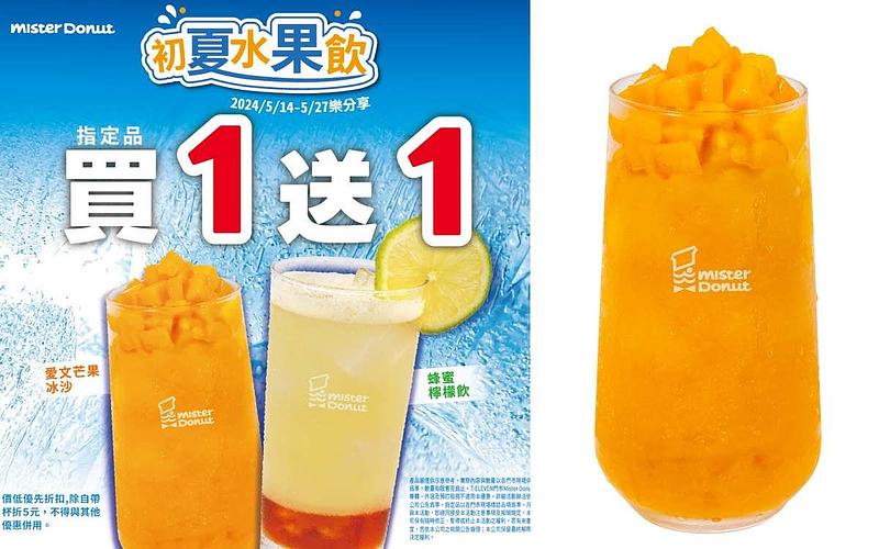 活動方式:指定飲品愛文芒果冰沙或蜂蜜檸檬飲享買1送1優惠。