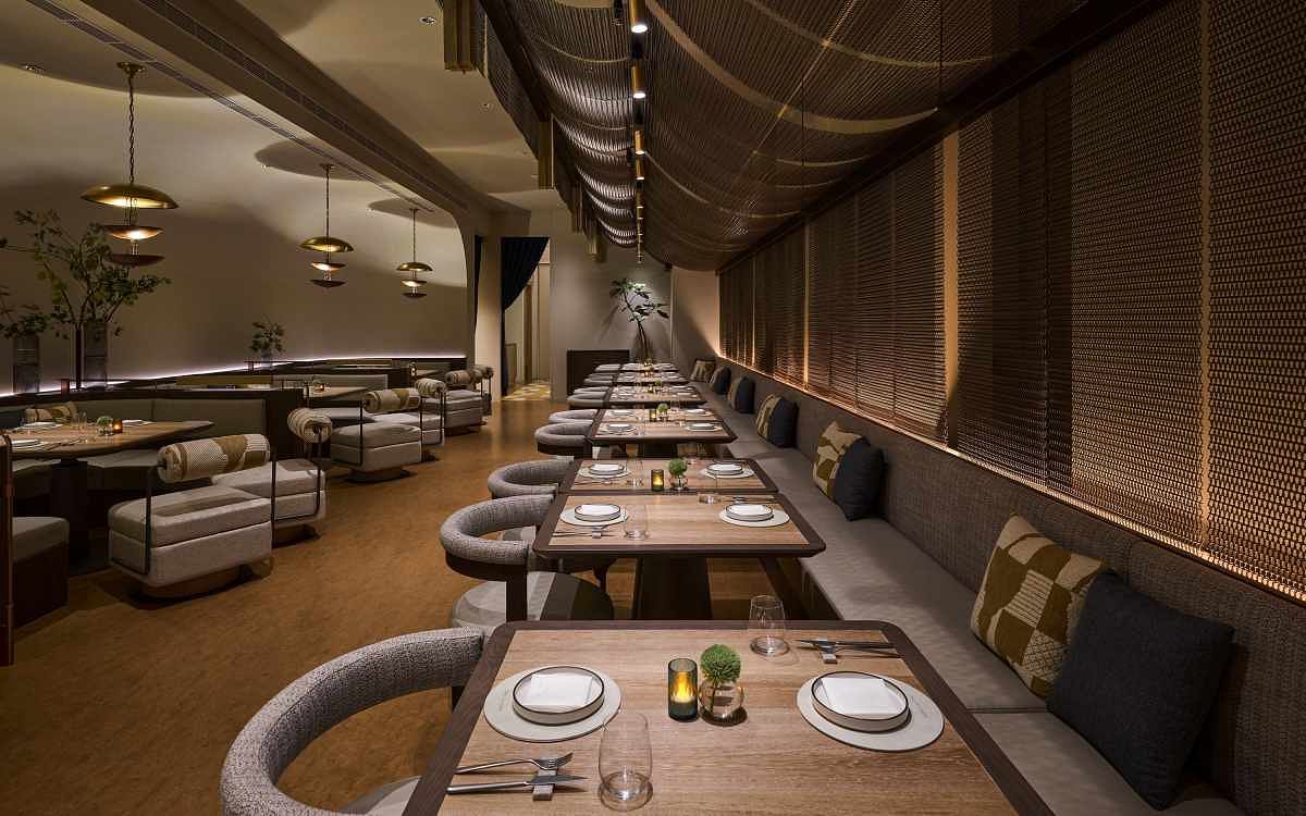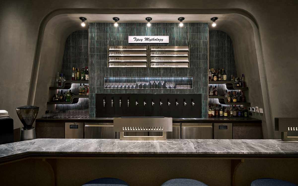 TIPSY Sparrow是指微醺的麻雀,麻雀常被視為自由與活潑的象徵,呼應餐廳提供多元餐飲,為都會生活注入更多樂趣。甫入餐廳,映入眼簾的是黛綠色的磚片與米色洗石子牆面相互輝映,再搭配玲瑯滿目的酒瓶營造輕鬆氛圍,進入用餐區後一側是如洞穴弧形設計的座位區,另一側是金屬網棚的座位區,四周以綠植妝點為空間帶來活力。餐廳室內為91坪,共有64個座位,並有兩間包廂分別可容納6人與10人。