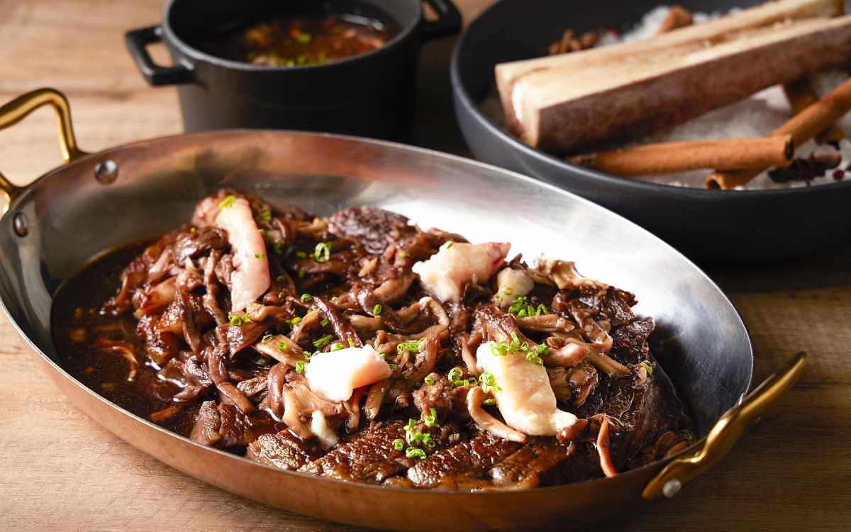 圖片來源:台北寒舍艾美酒店「烤肋眼牛排,牛骨骨髓波爾多醬汁」1,980元+10%,粗曠的肋眼牛排淋上由波爾多醬汁、波特酒以及蘑菇融合製成的醬汁,桌邊服務時將牛骨髓刨在牛排上,帶來兼具視覺與味覺的奢華新享受。
