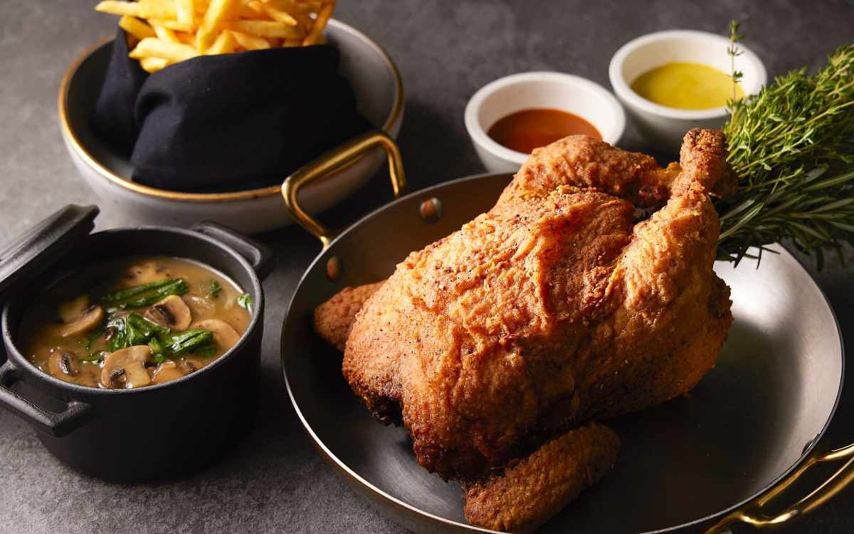 圖片來源:台北寒舍艾美酒店美國中部鄉村經典的「炸全雞,鴨油薯條,鄉村肉汁」880元+10%,將雞肉泡在優格中讓肉質更軟化,配菜是鴨油炸薯條,佐料推薦是以蘑菇、菠菜、奶油與威士忌製成的醬汁。