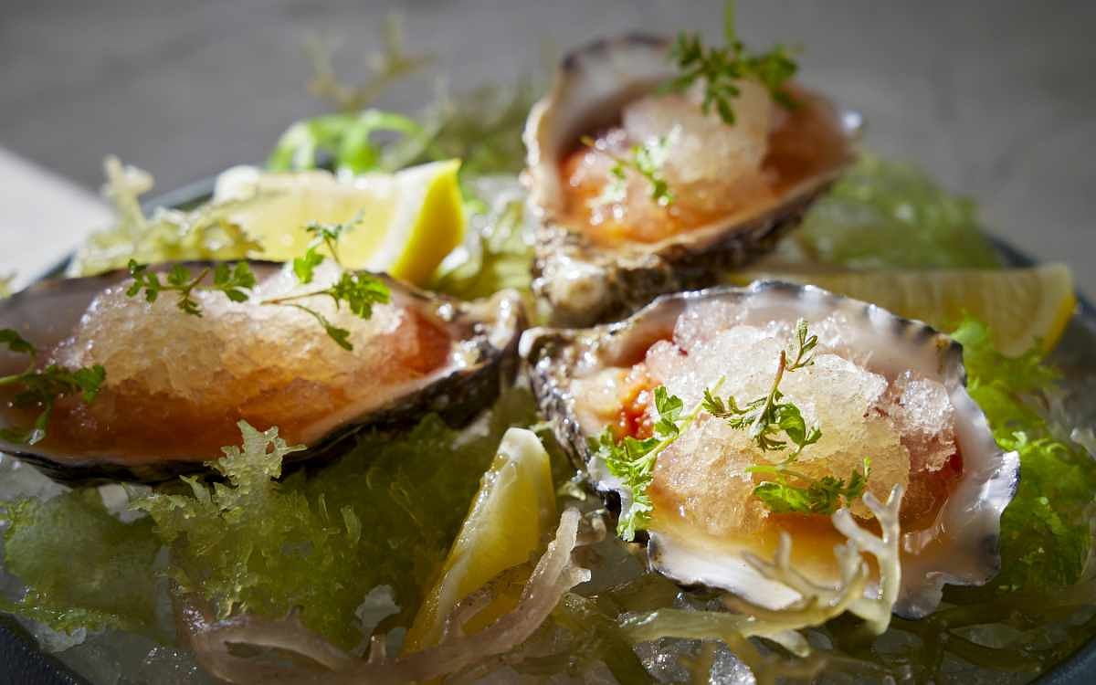 圖片來源:台北寒舍艾美酒店餐廳符合現代國外主流趨勢以提供單點服務為主,主廚推薦為「吉拉朵生蠔, 雞尾酒醬, 塔巴斯克冰沙」320元+10%(顆),將塔巴斯克醬加上檸檬與糖水,先冰鎮後再打碎製成冰沙,涼爽口感為生蠔增添清新驚喜。「烤蝦,柚子胡椒優格,涼拌菜絲」580元+10%,先以美式啤酒浸泡草蝦再塗上叻沙醬與蝦醬製成的醬料後碳烤,配菜是由柚子胡椒優格拌製而成的涼拌菜絲,一解油膩。