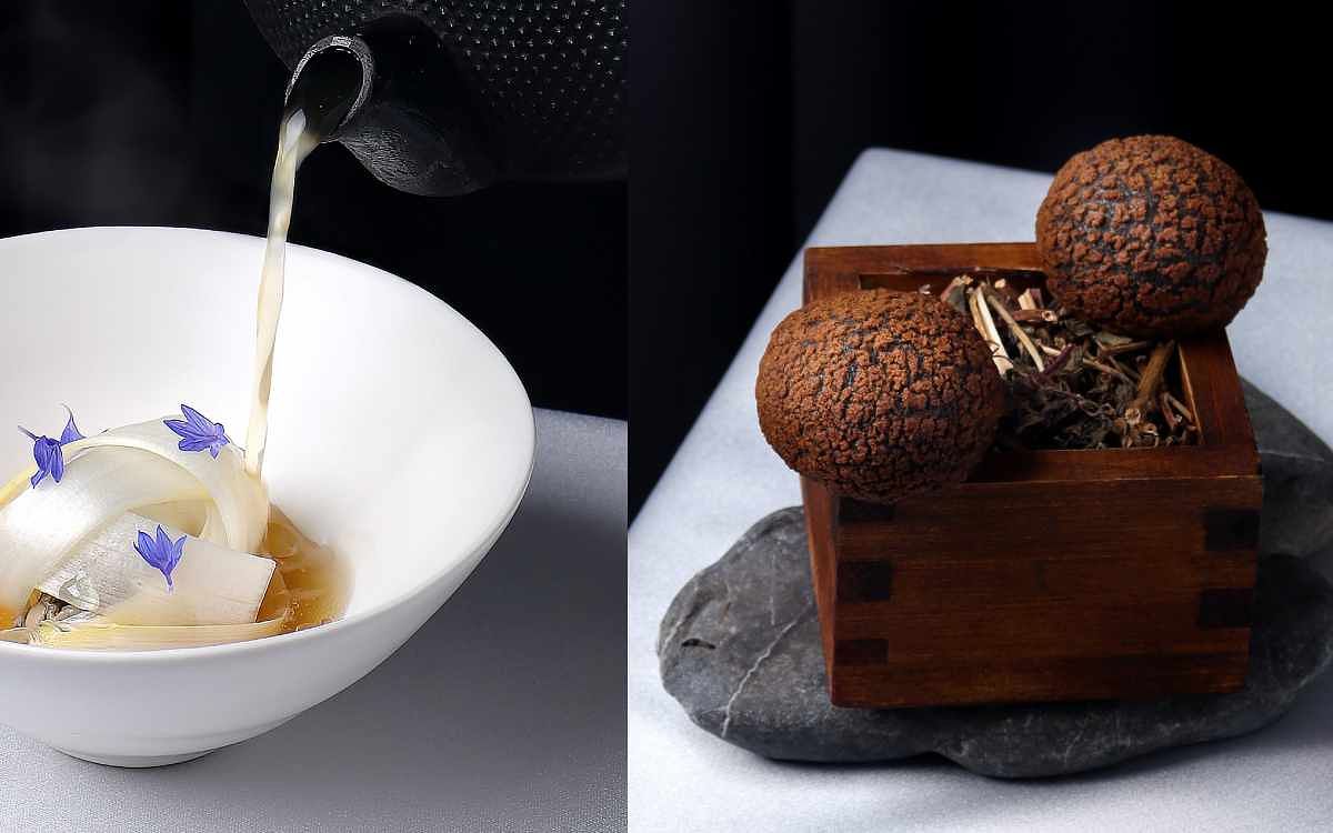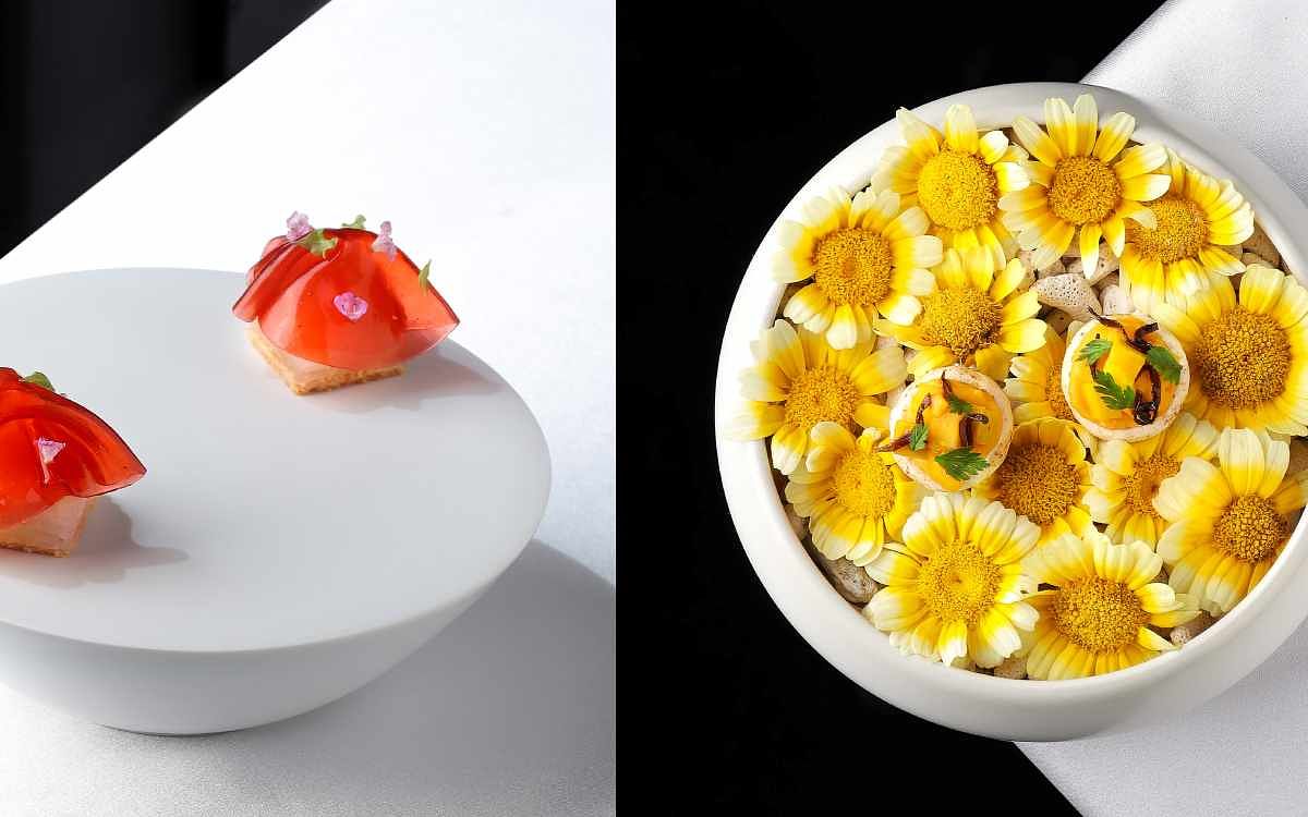 主廚Ling表示,本季菜單分為春萌與夏長兩階段,以春季的百花盛開延續到夏季的滋長,第一道開胃菜就由發酵南瓜與昆布的融合展開序幕,映入眼簾的春菊盤飾盎然十分吸睛,餐點模樣形同島嶼般的外型,是主廚心目中屬於春天的天空之城,甜鹹滋味宛如春夏協奏的開場曲,緊接著當季的澎湖紅甘搭配晶瑩剔透的紫蘇凍,鮮甜的肉質被紫蘇的微酸味激活,入口的雅緻與驚喜,是場分秒必爭的味覺饗宴。