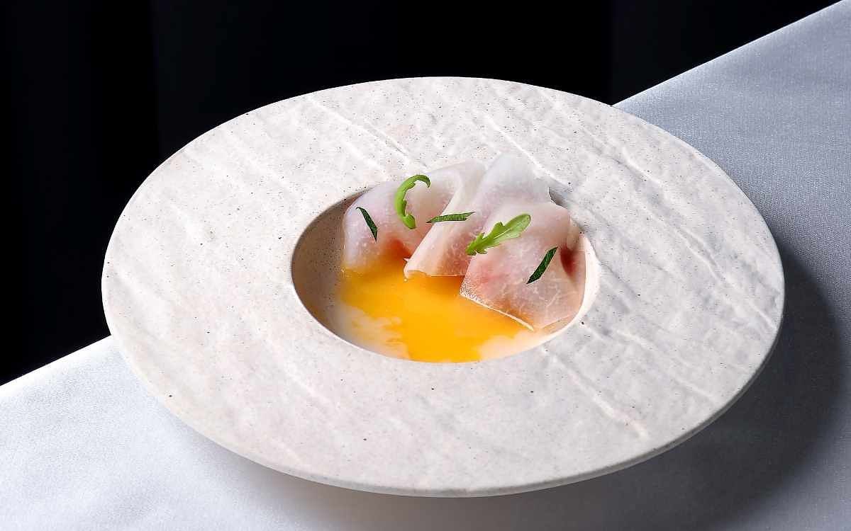 圖片來源:MÚO 主廚Ling喜歡在旅行中發掘各種美味,更擅長運用家鄉特色的食材入菜,家鄉在屏東的主廚本季以東港新鮮的櫻花蝦,搭配類似水牛起士的絲綢乳酪,添上魚子醬濃郁的組合,也預告本套菜單順序正式進入夏季的環節,炸過的櫻花蝦香氣四溢,佐以絲綢乳酪微酸的調味中和後,絲毫不見油膩感,一旁的薄餅脆片,是台灣知名的小吃蔥油餅的延伸,一口咬下竟還有櫻花蝦的香氣,原來是主廚用新鮮的櫻花蝦烘乾後磨成粉,加上杜蘭小麥調製而成,淡淡的甘梅香氣則來自原住民部落的「鹽膚木」來點出特色,這也是本季最受貴客喜愛的菜品之一。