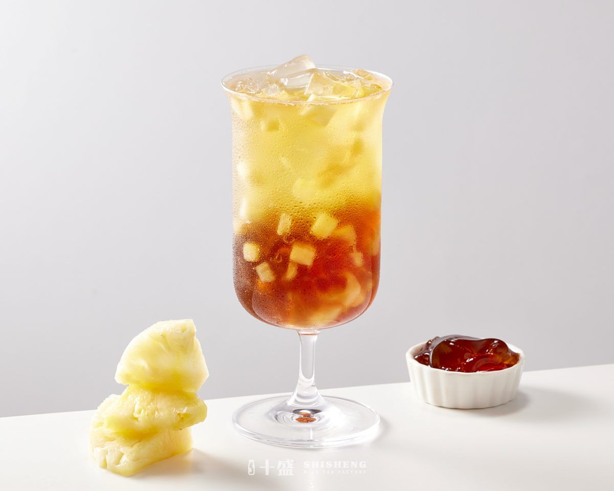 特別選用金鑽鳳梨、台農17號、土鳳梨等不同品種,以天然蔗糖細火慢熬,在香片茶湯中交疊出豐富的酸甜滋味。飲料中特別添加手作蕎麥蕨餅,鮮切鳳梨果丁與彈滑蕨餅,喝好喝滿超過癮。