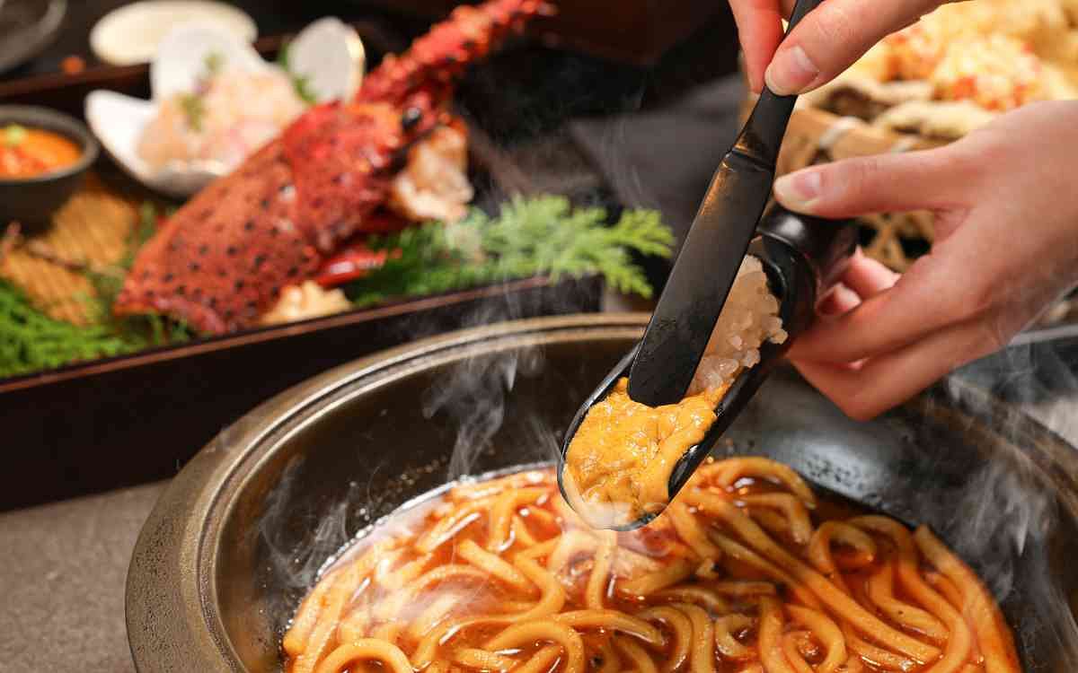 圖片來源:三燔本家濃郁暖胃、令人垂涎欲滴的「海老海陸咖哩鍋」也是不可錯過的美味聖品,主廚取鮮嫩的龍蝦蝦膏、蝦肉與濃郁的咖哩蝦湯完美交融,海鮮的鮮甜和咖哩的香濃譜出迷人的香氣,搭配油菜、筊白筍、玉米、南瓜等季節時蔬和頂級美國無骨牛小排一同涮煮,風味層次更加升級。享用完鍋物後,充滿海鮮菁華的咖哩蝦湯,將由服務人員在桌邊烹煮鮮味十足、熱氣騰騰的「蝦膏烏龍麵」,入口香氣四溢、味濃而飽足。套餐另有以冰涼清甜的海膽冷豆腐、以及經過現榨柳橙汁浸泡天然海藻而成的橙汁水雲醋和搭佐鹹甜八方汁上桌的油菜花蛋黃醋,三款開胃菜組成的「春季三點盛合」,甜點則是外觀可愛討喜的「草莓最中餅」,細緻甜蜜的口感,為精彩的套餐畫上美麗句點。