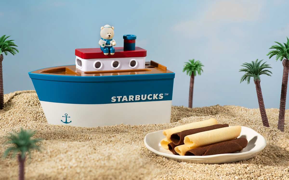 圖片來源:星巴克這個夏季與Bearista一起向夢想航行探險吧!「綜合mini奶油捲收納艇」組合內載運了mini海鹽雪茄捲及摩卡奶油捲,是適合在休憩時光款待自我、或與三五好友分享的精巧美味點心。