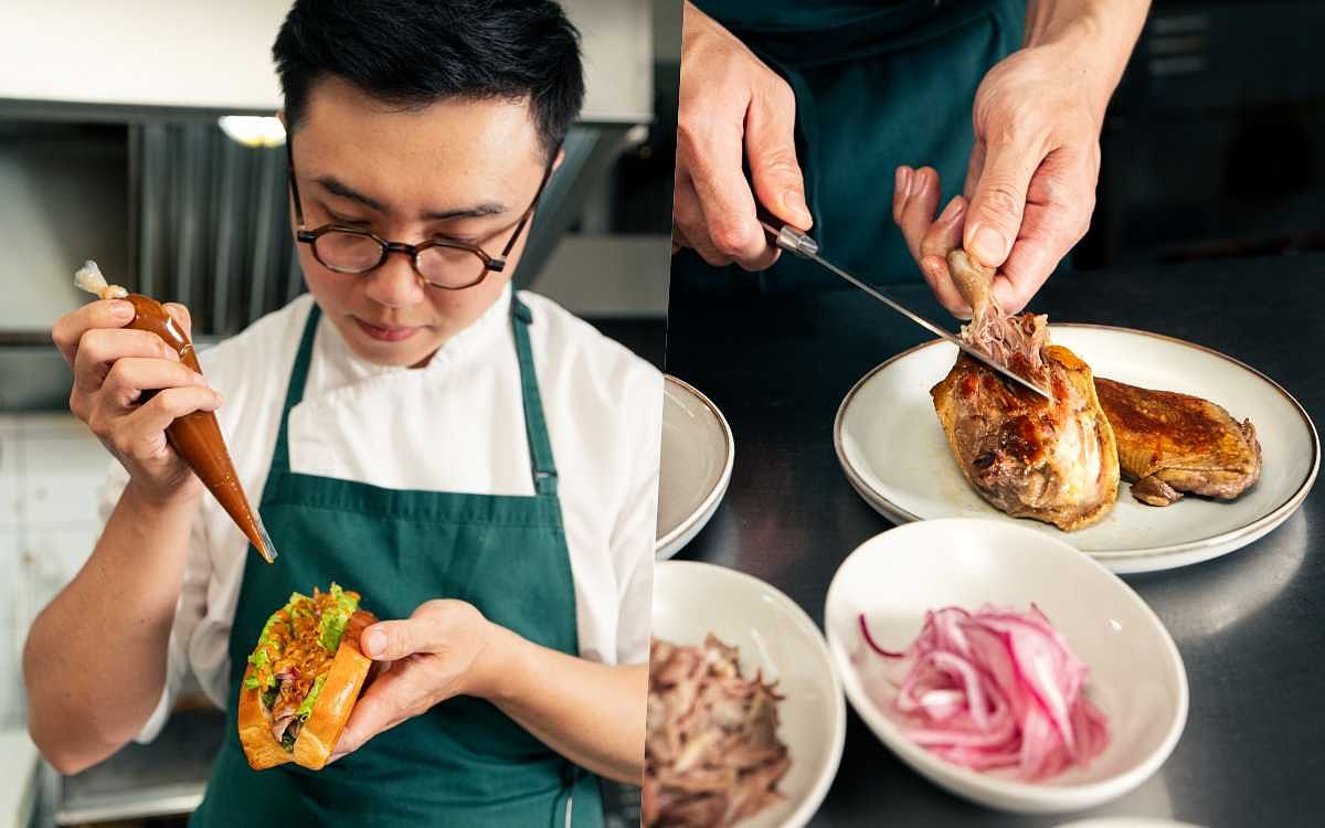 精通各式歐陸烹調技法的「香色」主廚邱一中,挑選宜蘭豪野鴨的鴨腿肉,以肉夾饃的概念為靈感,創作了一款「油封鴨腿潛艇堡」。邱一中從自身旅遊經驗中搜尋印象深刻的早餐記憶,回想起中國西安知名的小吃肉夾饃,以餅夾肉絲的組合為主體,將潛艇堡的麵包雙面烤得金黃香脆,再放入豐富的鴨腿絲。「油封鴨是一項討喜且大家熟悉的食材,將平時歐系餐廳會出現的料理融入日常早餐,會帶來不一樣的驚喜選擇。」