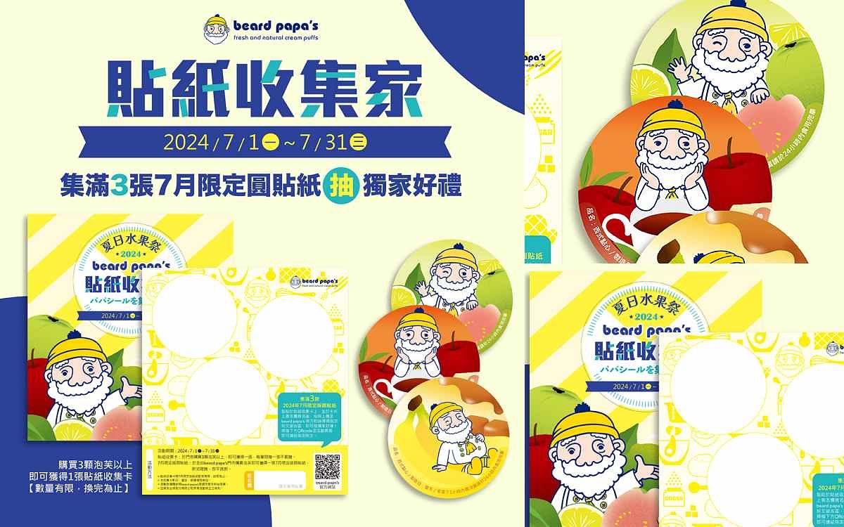 圖片來源:beard papa’s收集貼紙抽好禮!beard papa’s配合7月夏日水果祭加碼推出「貼紙收集家」活動,活動期間於貼紙收集卡貼上7月限定版三款圓貼紙,並拍照上傳至beard papa’s官方粉絲專頁的指定貼文留言區,就有機會獲得獨家好禮!