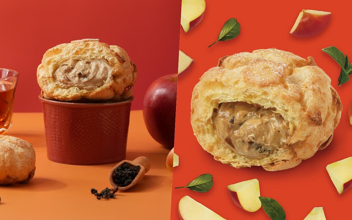 圖片來源:beard papa’s「蘋果茶凍歐蕾」($80起/顆,桃園、新竹、台中共7間門市販售):蘋果泥、牛奶及beard papa’s經典卡士達的相遇,創造出香氣淡雅,甜蜜誘人的蘋果歐蕾卡士達內餡,接著加入醇厚滋味的紅茶凍,加料口感一吃就停不下來!同時滿足水果系、茶系、加料系的泡芙,每口品嘗都完美地將果香與茶香結合,讓人越吃越涮嘴,吃完「果」然有好事。