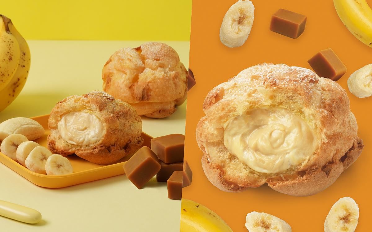 圖片來源:beard papa’s「香蕉太妃牛奶」($80起/顆,台南、高雄共5間門市販售):香氣滿溢的香蕉果泥、甜而不膩的太妃糖及牛奶,以絕佳比例拌入beard papa’s經典卡士達,製成香蕉太妃牛奶卡士達內餡。一口咬下,香蕉獨特的香氣爆棚,接著迎來太妃糖的甜蜜襲擊,甜而不膩的絕佳滋味搭配絲滑柔順的卡士達口感,每一口都充滿幸福,快來跟爺爺「蕉」個朋友,一起吃泡芙吧!